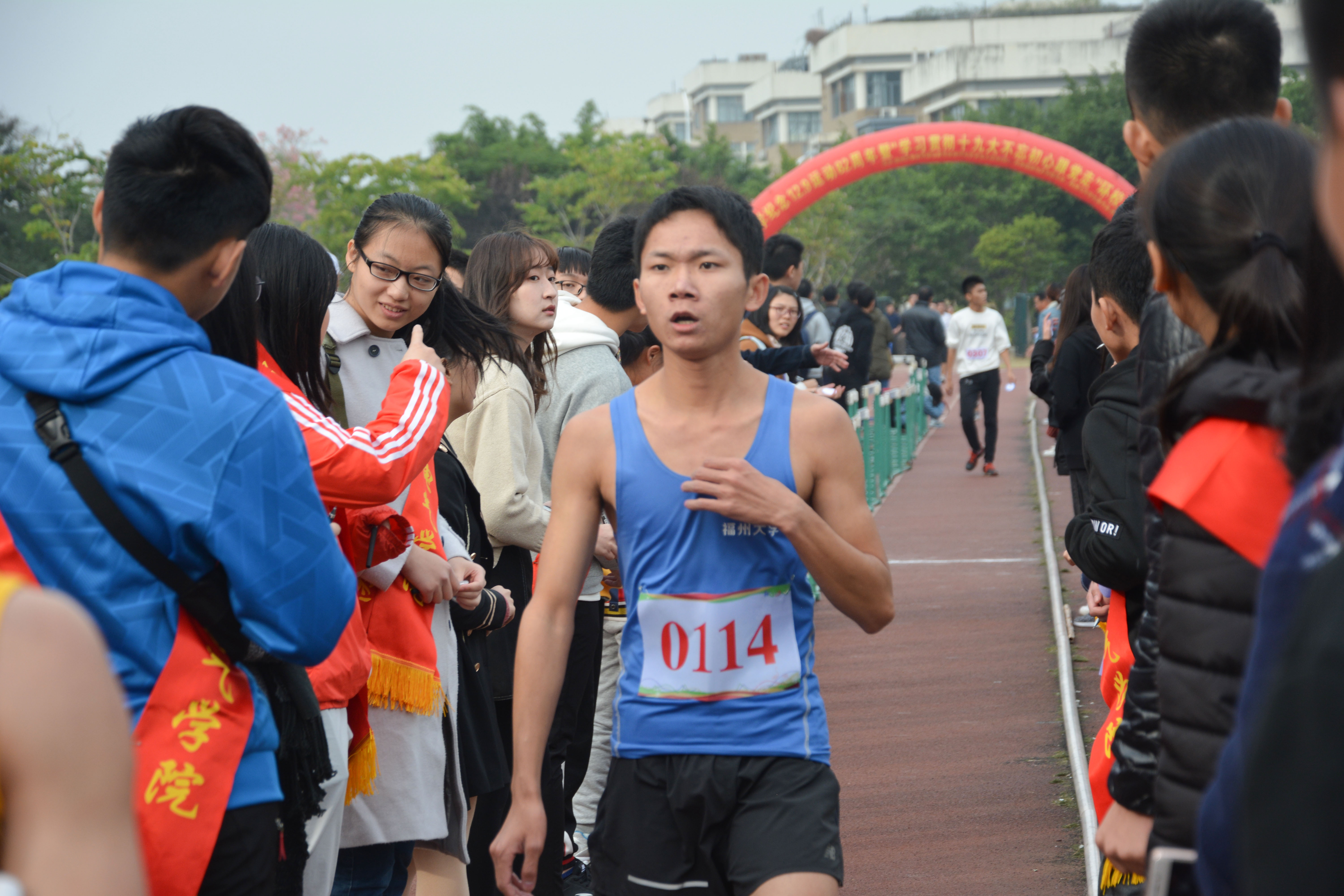 南门、东门、北门,最后回到第一田径场。环校跑犹如漫漫长征路,参赛的同学们或许会疲惫、会怠倦,但他们不曾停下脚步。他们秉承红军战士坚韧不拔的精神,一直坚持到了终点,完成了本次的环校跑。这就犹如中国共产党几十年来同人民一起拼搏,同人民一起前进,同人民一起梦想的长征路。在环校跑的路上不难发现每一组都有一个引路领跑的志愿者,而细心的运动员还会发现,每跑几步,都会有一个拿着方向标指路的志愿者,令人倍感温暖。就像是在长征路上,老百姓为中国共产党提供帮助一般。
