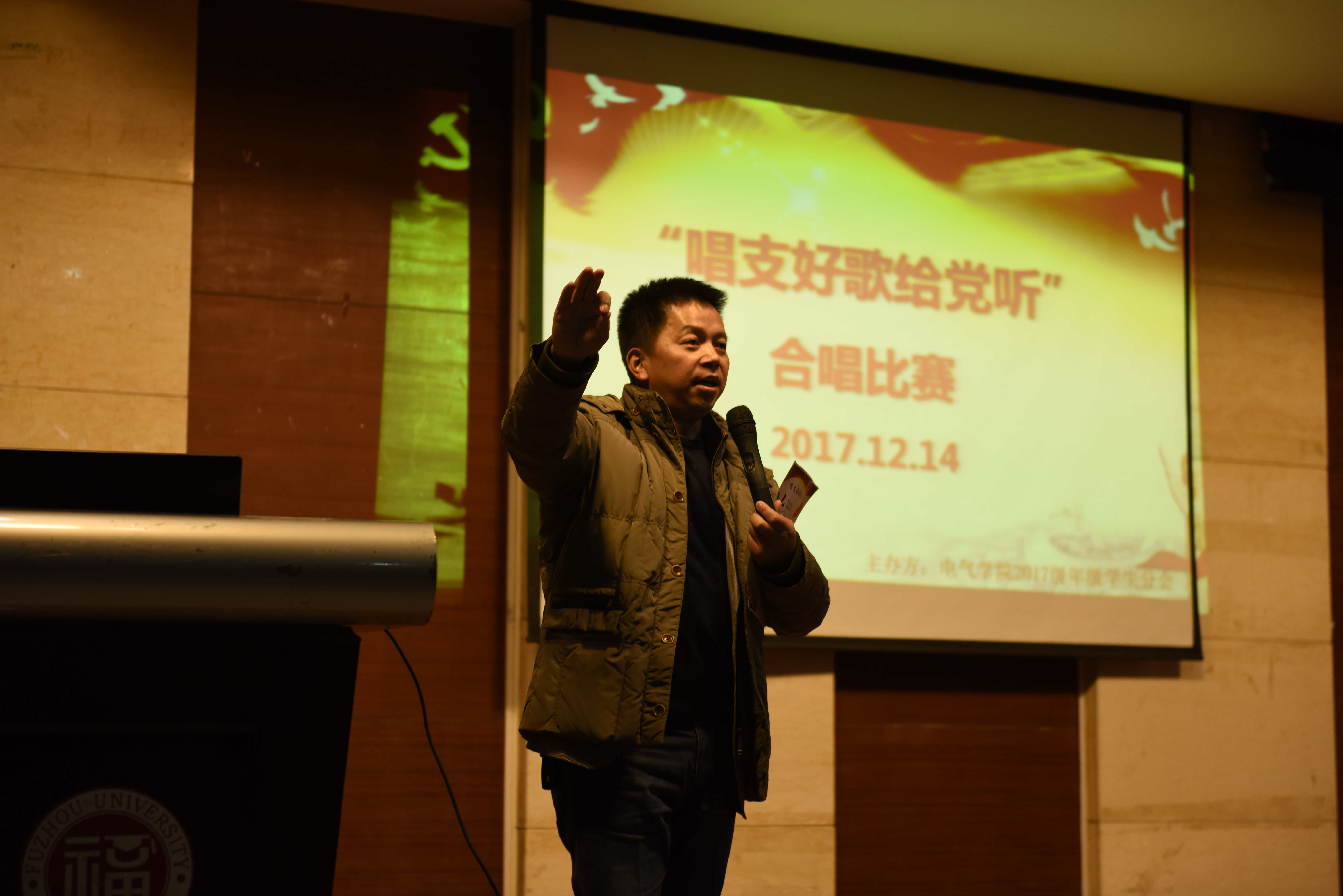 精彩、振奋人心的比赛结束后,院党委副书记黄国辉老师做了专业的点评。他先提出了好的方面:主办单位的组织能力、演唱曲目的选择、合唱效果、从大家合唱的表现中感受到的刻苦训练以及2017级的精气神。也提出了需要改善的地方:音调、指挥和音色等。同时,他讲到军训可以培养同学们的体质、意识 、品质和严谨作风,同学们应注意内务卫生、认真对待队列训练,实现真正的顶天立地。最后,教官们集体起立,受到同学们饱含敬意和谢意的掌声。同学们一起喊出口号:福大电气,顶天立地。