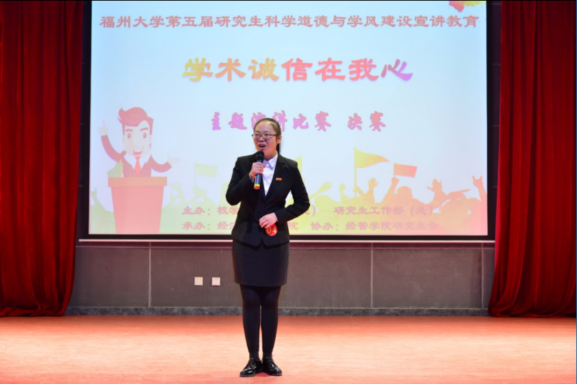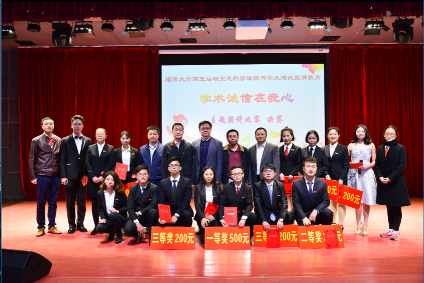 比赛开始后,在场的选手分别对学术诚信进行了引人入胜讲演,他们激昂高亢,深情饱满,自信满满地站在台上完成了各具风格的演讲,富有感染力的神态动作和声情并茂的语言表达一次次打动了在场的评委和观众,赢得场下阵阵掌声。在评审方面,比赛由评委当场进行统计并按出场顺序分四次,三人一组公示分数。参赛选手演讲结束后,评委老师对各个选手进行专业的点评,并由主持人公布了最终的获奖名单,选手依次上台领奖。全场观众对获奖的同学都报以热烈的掌声。比赛结束后,获奖的同学上台与辅导老师、评委以及学院代表进行合影留念。