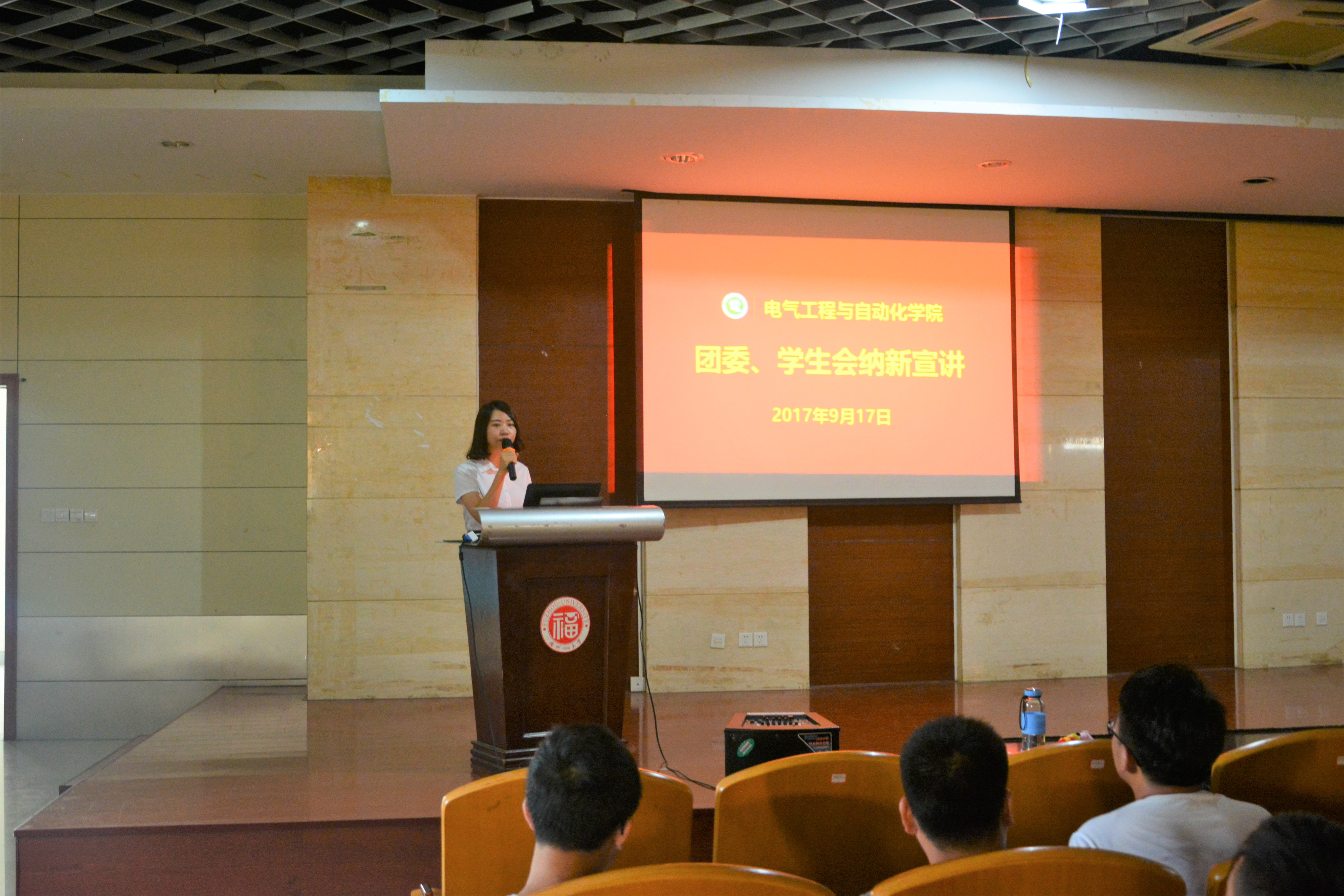电气学院于素质拓展中心举行团委、学生会纳新宣讲。宣讲会按照功能中心分组,文化体育、素质拓展、科创实践、自助服务、机要管理、媒体宣传中心的各部门依次登场。