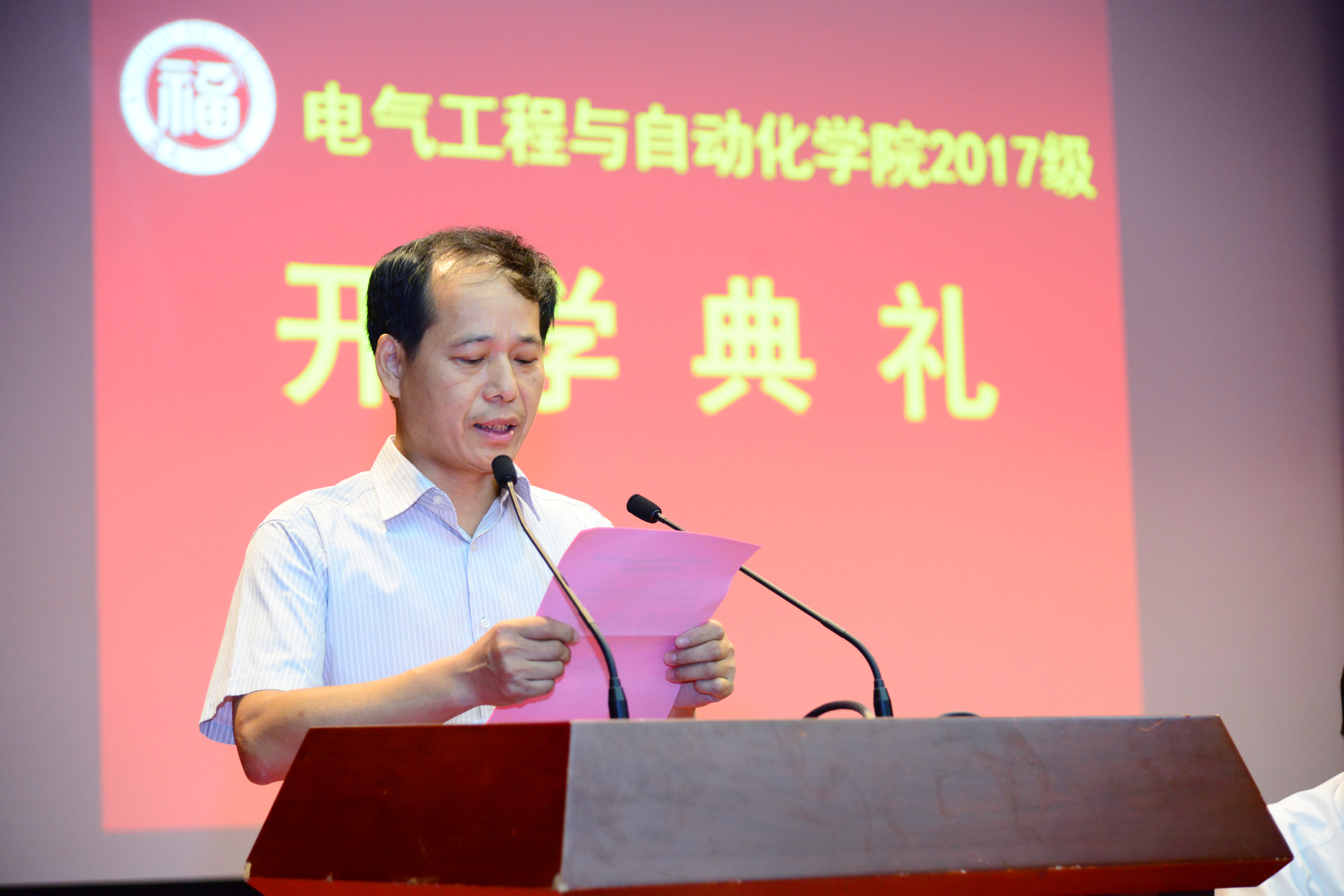 2017年9月19日早上,电气学院2017级新生开学典礼在图书馆博学厅隆重举行。作为开辟大学生活的一个重要仪式,17级新生们在各班导的带领下早早来到博学厅一楼,17届研究生则来到博学厅二楼就坐。上午8时30分,开学典礼在学院党委副书记黄国辉的主持下正式开始,他首先介绍与会嘉宾:电气学院党委书记何希耕、许志红院长、党委副书记黄国辉、薛毓强副院长、邵振国副院长、恒锋信息科技股份有限公司董事长魏晓曦以及厦门佳创科技股份有限公司副总经理王金城等。然后,全体起立,庄严奏唱国歌。