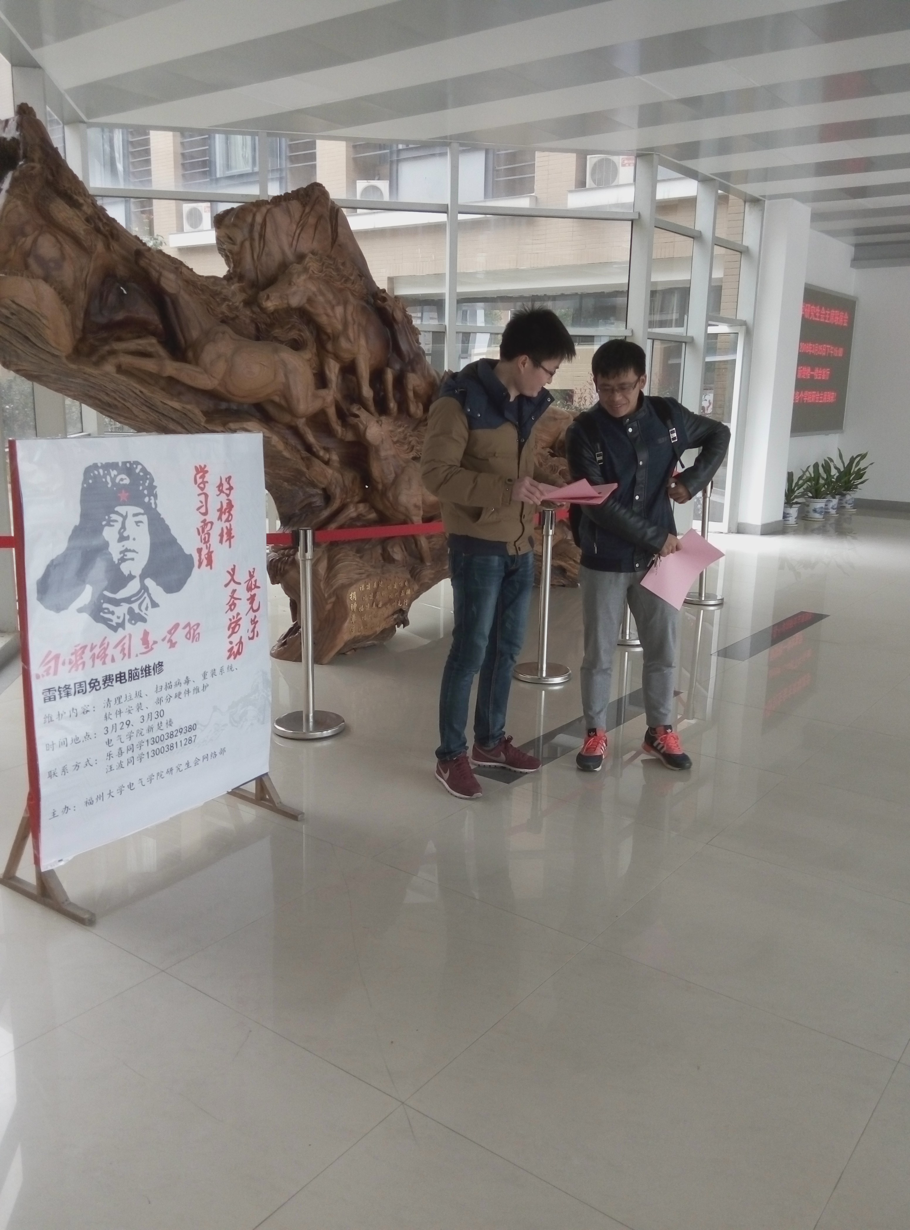 2016年3月28日,为积极响应、贯彻“两会”精神,电气学院研会网络部开展了“雷锋周”电脑义诊活动,为全院师生进行免费电脑维护、维修服务。