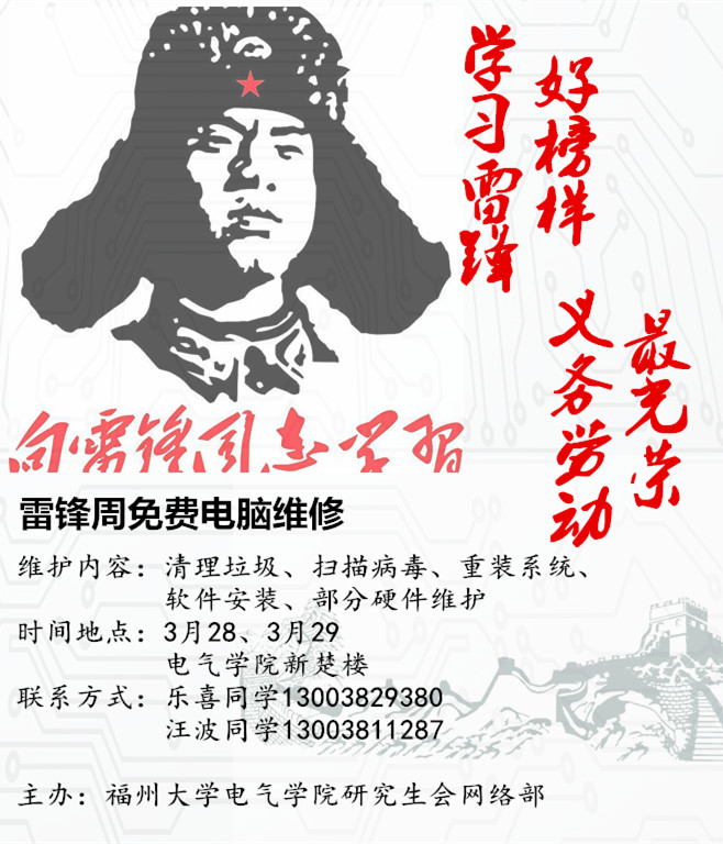 此次公益电脑维护活动,旨在贯彻“两会”精神,并进一步弘扬雷锋精神,以实际行动为全院师生排忧解难,受到了师生们由衷的欢迎和普遍赞誉。这次活动既提高了干部动手能力,进一步发扬了雷锋的无私奉献精神,又让同学们对雷锋精神有了更为深刻的了解,并引导同学们自发地学习雷锋,真正做到“为人民服务”,成为一个有爱心、责任心、感恩心的福大电气研究生。