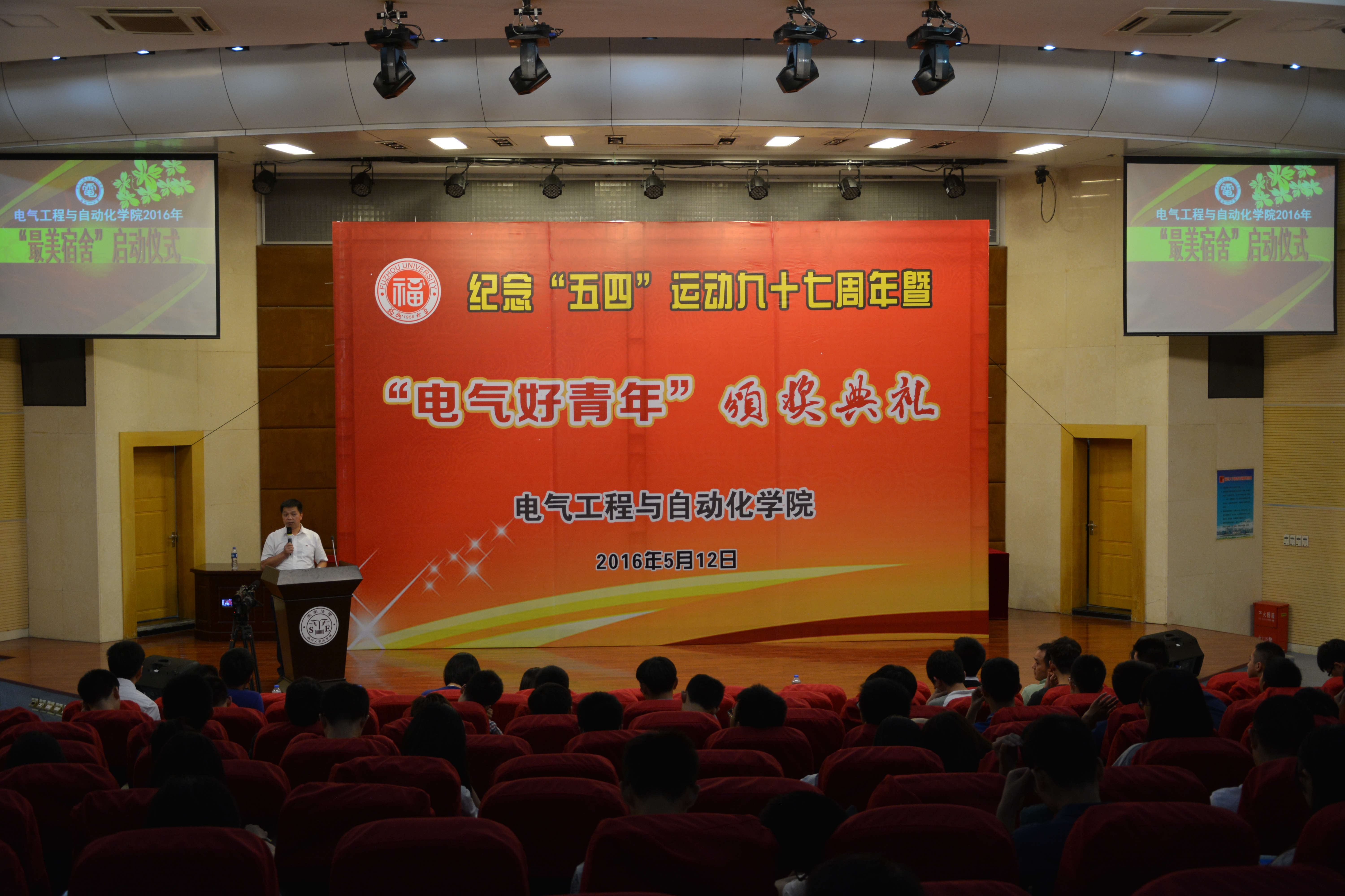 2016年5月12日下午,电气学院“最美宿舍”启动仪式暨宿舍歌大赛决赛在法学院模拟法庭举行。仪式由电气学院团委书记张志雄老师主持,电气学院学工组全体老师以及各学生宿舍宿舍长参加了大会。