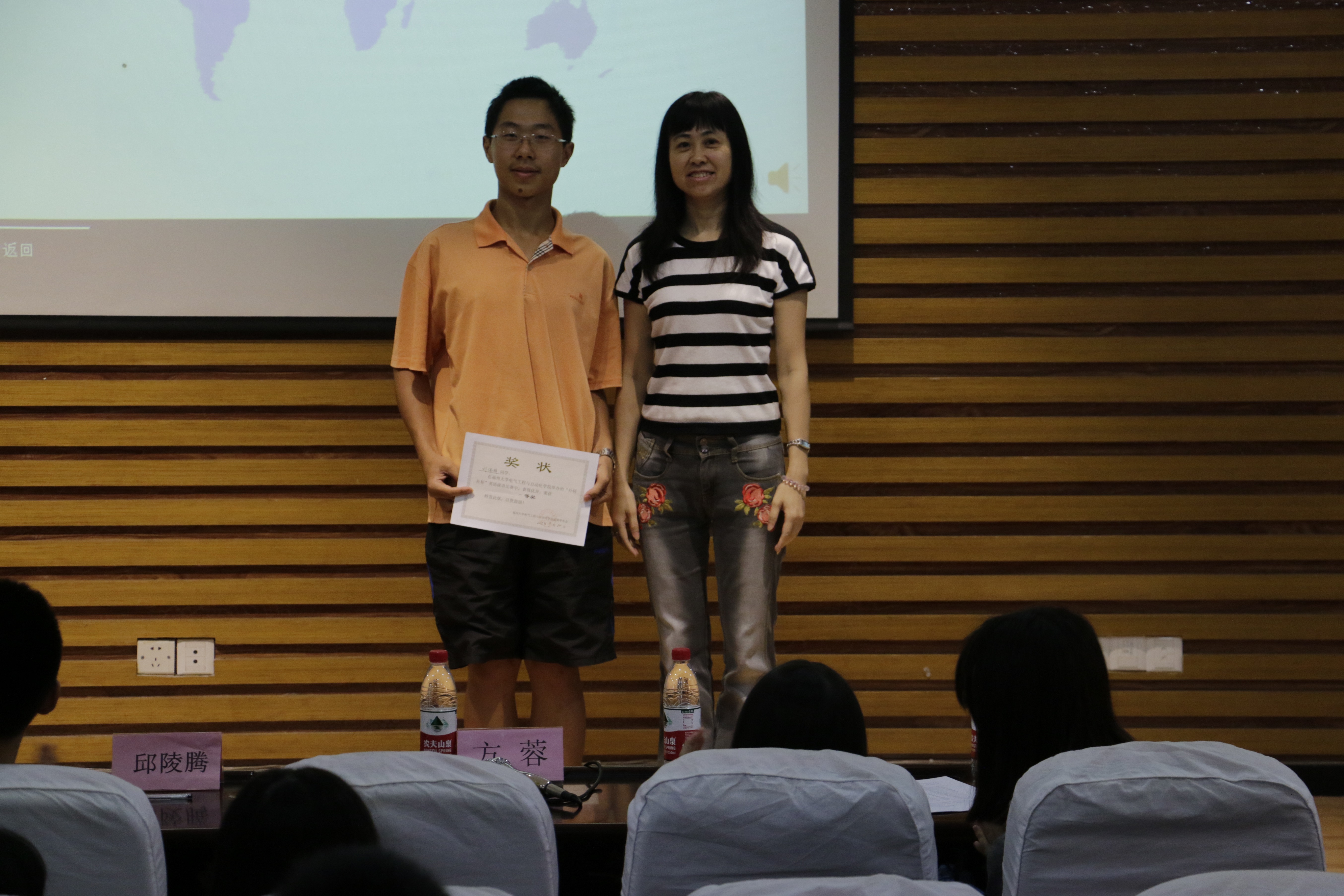 在主持人对比赛及其基本流程作简单介绍后,比赛正式开始,7名参赛选手按序上台发表精彩演讲。选手们慷慨陈词,将自身对题目的理解和感悟淋漓尽致地表达出来,活跃的思想、精炼的语言与流利的口语相交融,引起了观众的阵阵掌声。在经过几名评委老师的两轮评分过后,发生了一件让人意想不到的事情,两位选手的分数不相上下,所以现场临时增加可一个即兴演讲环节,由两位选手对“travel”这个词进行即兴演讲。在比赛接近尾声的时候,李玥对获奖同学一一做了点评,同时对获奖选手表示祝贺,对未获奖选手给予鼓励。凭着优秀的演讲和临场应变能力,刘伟明同学最终荣获一等奖,宋炜、邱丽晨两位同学荣获二等奖,吴晓静、徐海滨、范朝敏、陈玉如四位同学荣获三等奖。