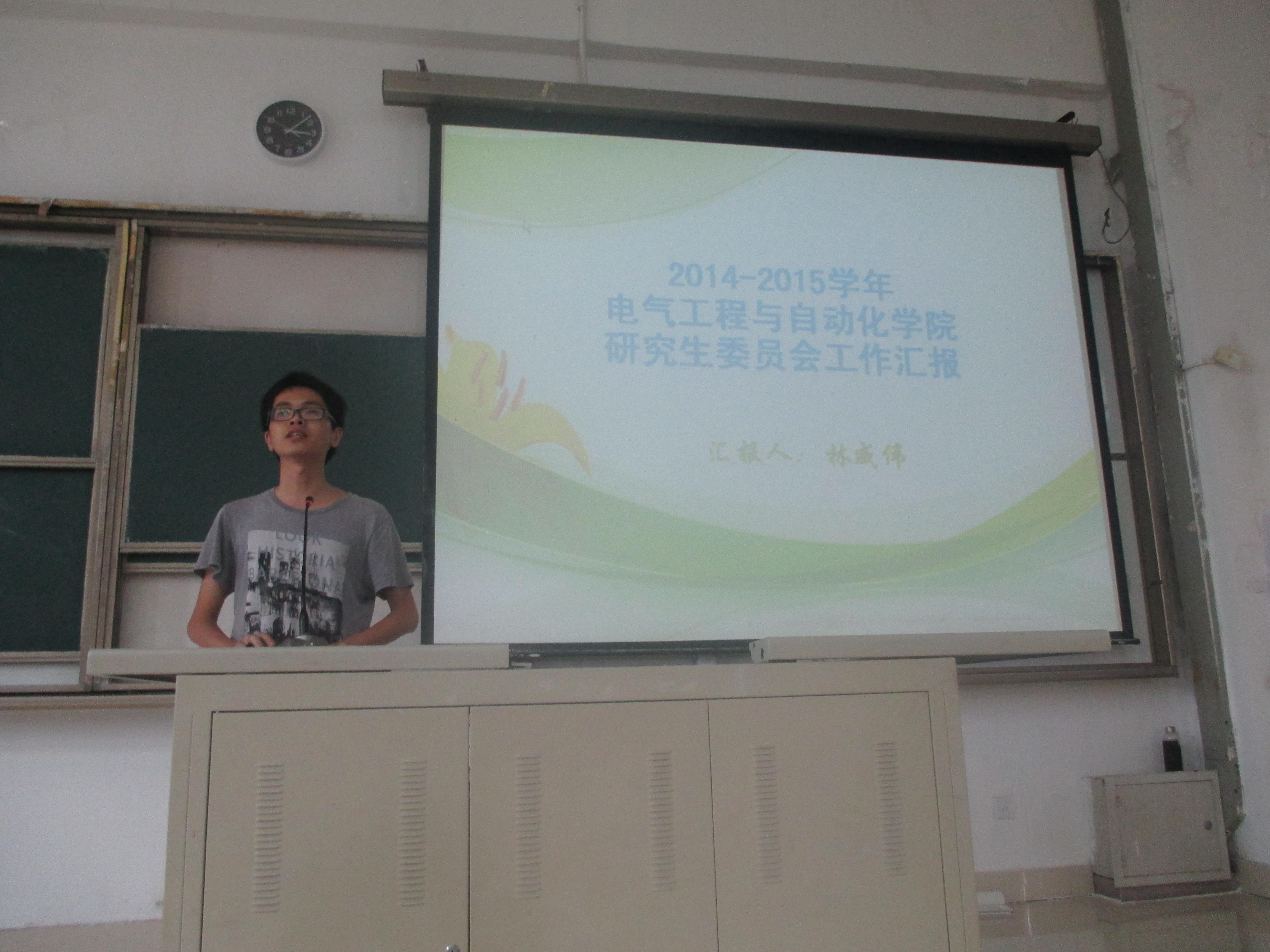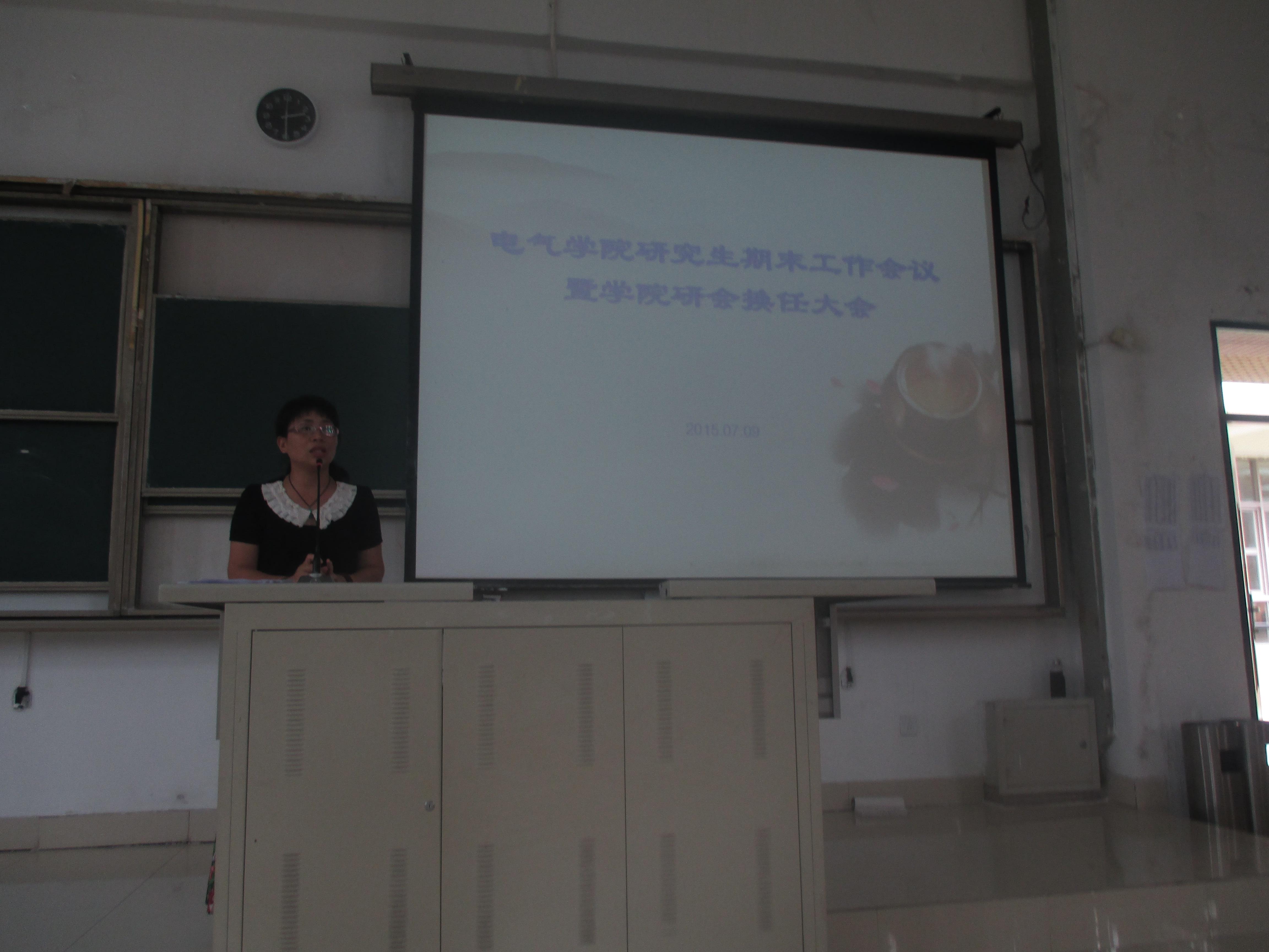 2015年7月9日下午14点30分,电气学院研究生期末工作会议暨学院研究生会换任大会在教学楼东3-100顺利召开。出席大会的有电气学院研究生辅导员许海燕老师以及电气学院全体研究生。