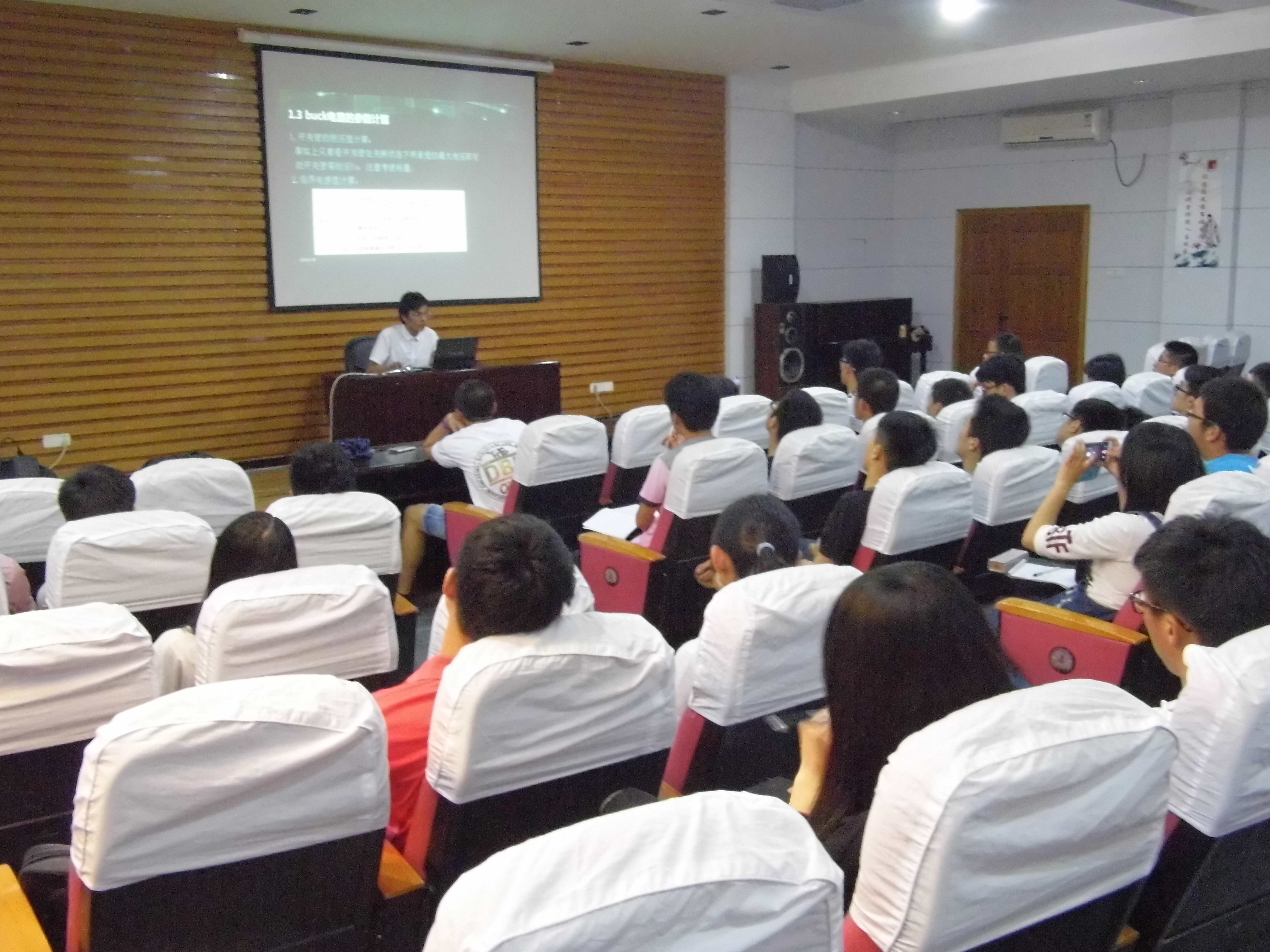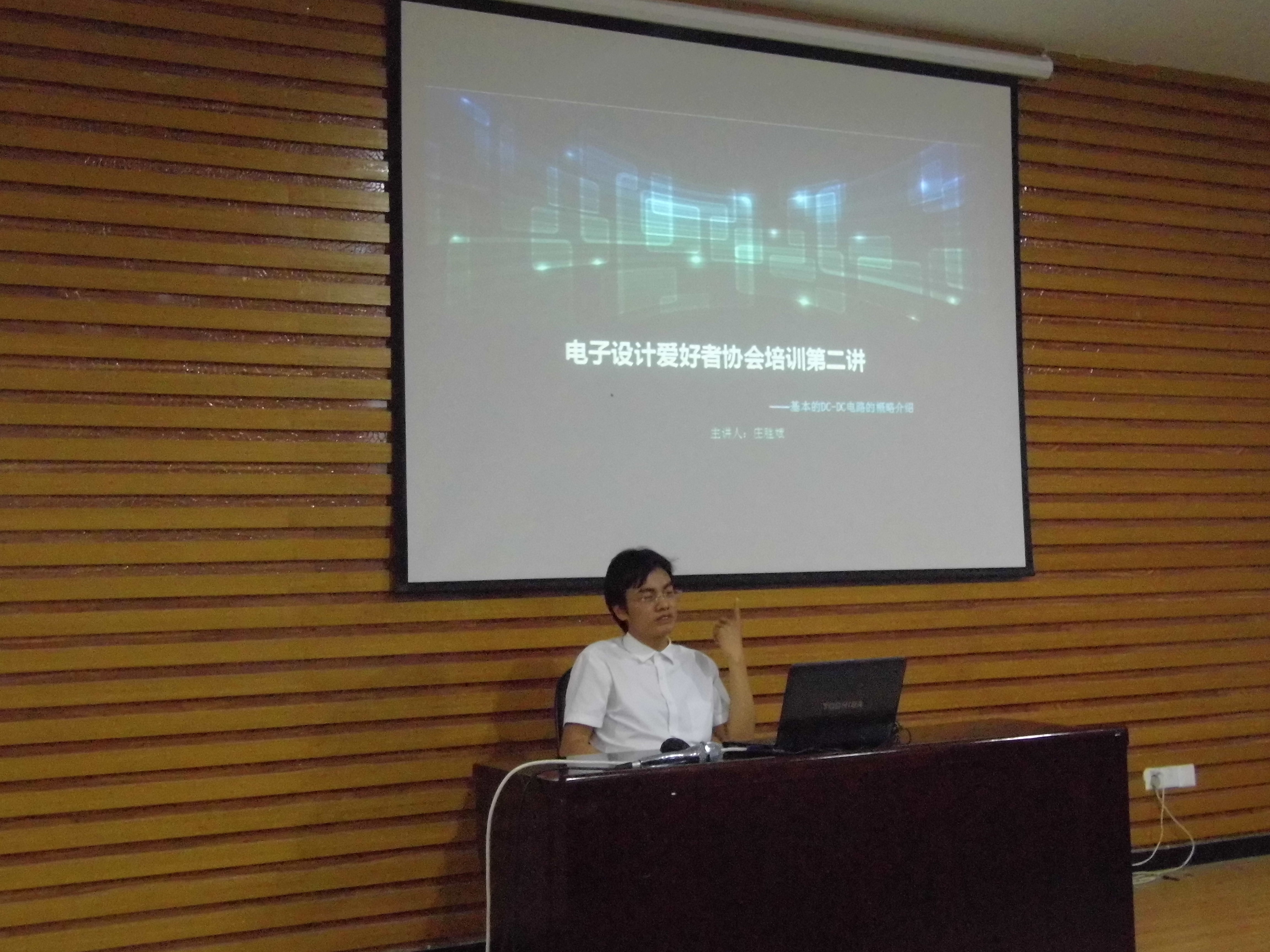2015年4月19日晚上7点,电子设计爱好者协会培训第二讲暨全国大学生电子设计大赛(电源类)培训在新楚楼北230开讲,本次培训主题是基本的DC-DC电路的概略介绍,由电气学院电子设计爱好者协会的会长庄胜斌主讲。