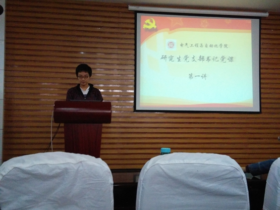 建设学习型党组织,是提高党的执政能力、保持和发展党的先进性的紧迫任务。为了积极推进学习型党组织建设,提升研究生的政治理论水平,促进研究生科研能力和创新精神提升,2015年4月24日下午3点,在电气学院多功能厅举行了“研究生党支部书记党课”第一讲。