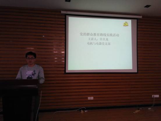 此次活动由电机与电器研究生党支部书记许共龙和电气工程研究生第二党支部副书记吴小雁以微党课的形式与党员进行学习交流。参加此次党课的有许海燕辅导员以及电机与电器研究生党支部和电气工程研究生第二党支部的全体党员。首先,由许共龙引用当前热点时事,陈述“四风”现象,对形式主义、官僚主义、享乐主义、奢靡之风逐一进行介绍,同时结合党员身边的一些案例,如“光盘行动”等,号召大家从身边做起,以身作则,杜绝“四风”。接着,吴小雁结合当前大学生政治信仰的“真空化”、“利益化”“物质化”的现状,讲述中国梦如何引领大学生政治信仰教育,通过观看大型历史纪录片《信仰》,激励与会党员将自己的理想信念与“中国梦”结合起来,为实现梦想而努力奋斗,坚定共产主义信仰。最后,许老师对本次党课进行了总结,对党员提出杜绝“四风”,坚定信仰的要求,并希望党员将理论学习践行到实践中,充分发挥党员的先锋模范带头作用。