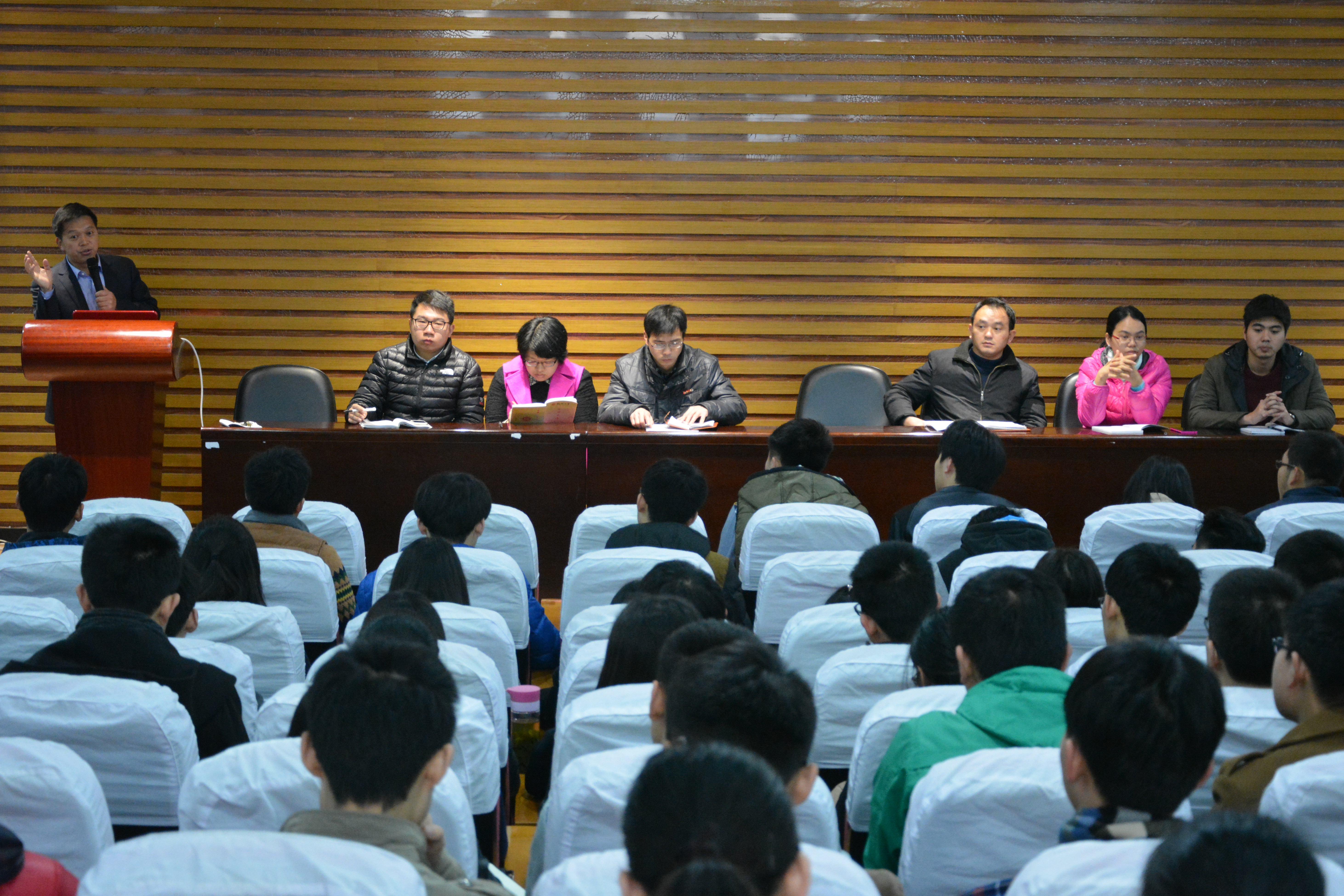 电气学院2014至2015学年下学期学生干部工作会议在新楚楼北230召开。出席本次会议的有电气学院党委黄国辉副书记,电气学院团委张志雄书记,电气学院团委沈庆斌副书记,电气学院12级辅导员陈荟芳,13级辅导员段小华、傅志强,14级辅导员尹万东,兼职辅导员茹晓东,以及学生干部等共百余人,其中,沈庆斌老师主持了此次大会。