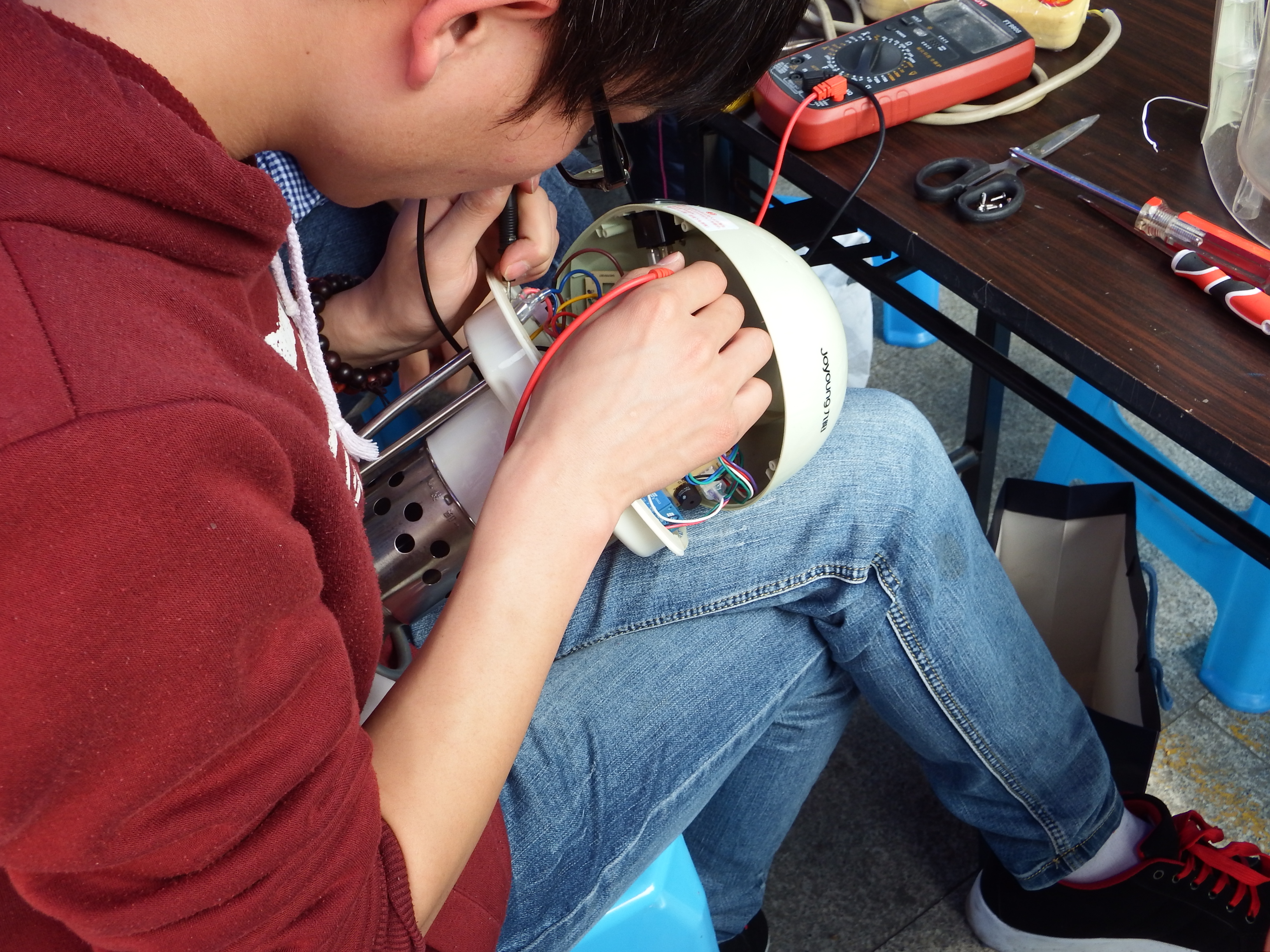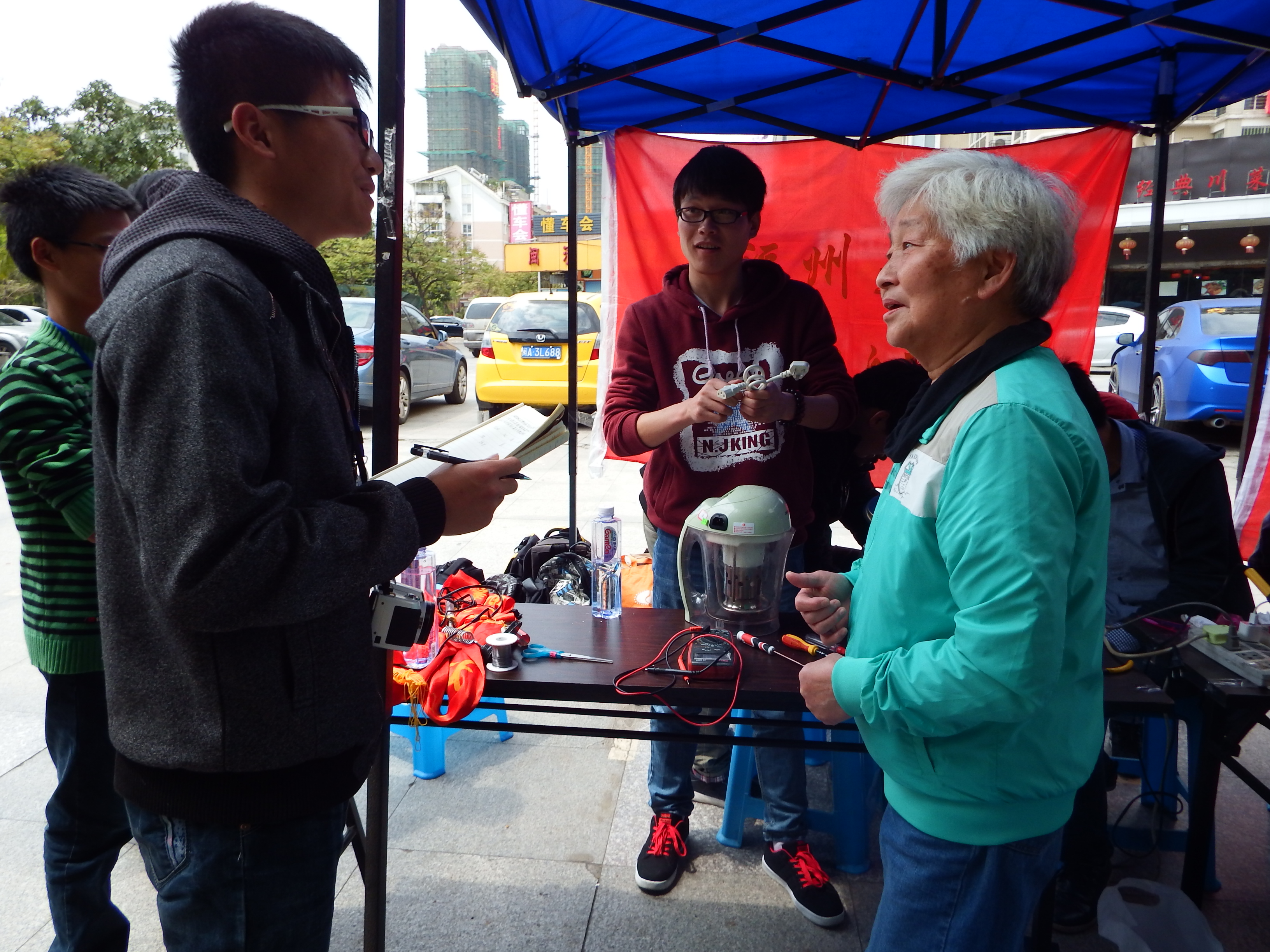 由于学院提前来到社区进行过宣传,活动一开始立即吸引了许多咨询的群众,他们对学院的活动感到新奇,有一些大叔大妈拿起手机开始拍摄学院的宣传横幅以及维修过程。第一位前来维修的是位保安大叔,他带来了一对音箱,这对音箱看起来有些年头了,或许是寄托着许多回忆与感情,大叔一直不舍得扔掉,因为太过于年旧,接头与现在的主流接头不兼容,维修人员耐心将电线拨开,细心地接了回去,大叔见到自己的音箱又可以使用了,显得非常高兴,临走前不住地说谢谢。随着时间的推移,来的人也越来越多,附近的许多居民都拿出了自己损坏的家电:如电饭煲、豆浆机、电吹风等。电饭煲与豆浆机里含有高度集成的电路板,不过维修人员依然靠着扎实的专业知识将它们修好。