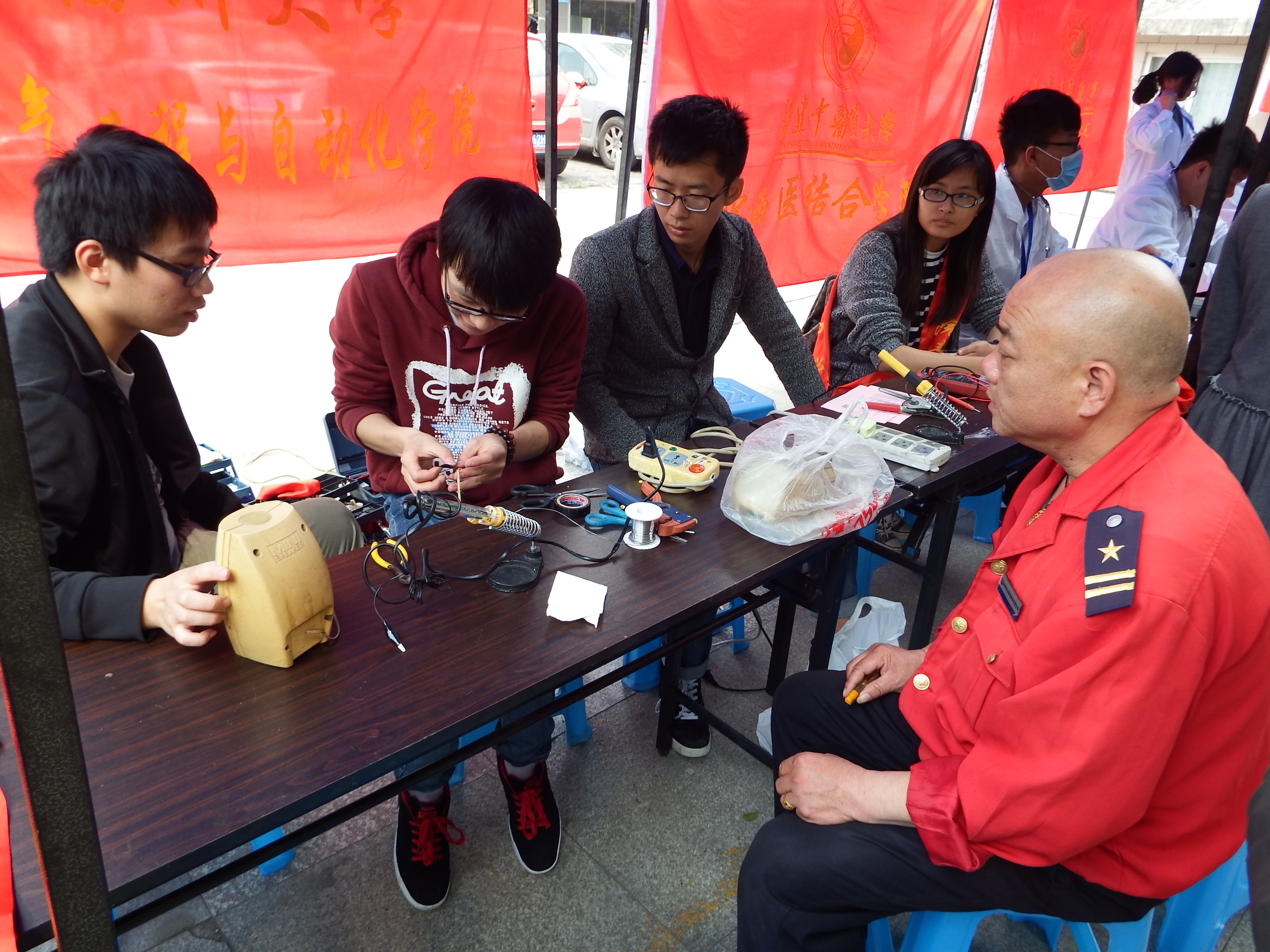 与福建中医药大学中西医结合学院组成的志愿者团队早早来到仓山区金麟社区开展了义务维修与义务问诊的活动。本次活动由2012级7班、9班团支部、电气学院团委学生会科技部以及中医药大学发陈医斋联合举办。