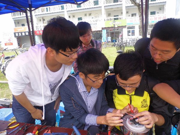 上午7点,两个部门就开始布置现场,拉起横幅和旗杆。科技部成员认真小心的做好检修设备的布置工作,青协成员们则登记下了同学们送来的故障电器的故障点及同学们的联系方式。科技部的同学们认真的检查修理故障电器,在遇到操作问题时高年级的学长们耐心指导。时不时拿起工具给他们手把手做示范。在这个过程中同学们学会了如何将理论与实际结合,对所学的知识有了更深的理解。同学们严谨踏实,维修速度之快质量之高获得了一致的好评。活动结束前,电气青协部长林伟斌及科技部部长谢阳腾向我们介绍了电气学院义务维修活动的历史,他们说道,自05年来该活动已连续举办了10年,服务范围从学院扩大到整个学校乃至整个大学城展现了电气青协服务大众的奉献精神和电气学院科技部过硬的科技基础和动手能力,十年相伴电气青协与科技部的合作愈加紧密,在学院中形成了良好的风气。在集体的合影留念之后,本次活动圆满落幕。