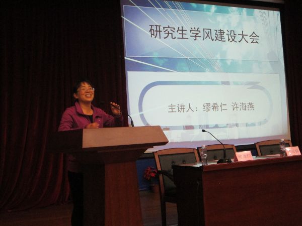 大会伊始,缪希仁教授语重心长地指出,研究生是学术研究的主力军,是创新型国家的建设者,进行科学道德与学风建设是研究生不可缺少的一堂必修课。他以生动的实例鼓励大家要脚踏实地努力投身科研,并希望同学们以发散的思维、昂扬的斗志、敏锐的嗅觉、冒险的精神、前瞻的视角、主导者的心态去发现有价值的新问题,大家从中受益匪浅。接着,许海燕老师充分阐述了研究生学风建设的重要性,指出了学术造假的危害性,她表示,开展学风建设大会,旨在引导研究生遵守学术规范、坚守学术诚信、摒弃学术不端行为,努力成为优良学术道德的践行者和良好学术风气的维护者,学生时代严谨朴实的研究作风,将使大家终身受益。