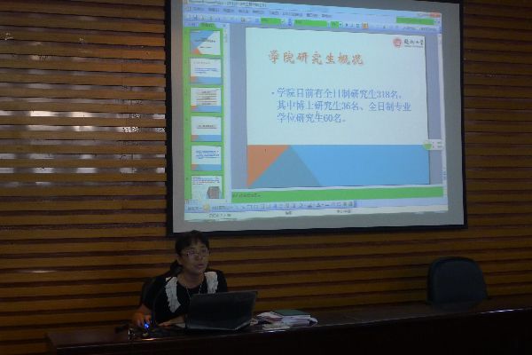 及各专业里的发展、规模、师资、管理等方方面面,并根据研究生入学手册,着重强调了在校的各项规章制度,让同学们在对学校,学院的概况有了初步的了解。接下来辅导员许海燕老师,针对性地从生活,情感和学业问题为新生们进行了分析指导,结合具体实例,积极引导,深入浅出又极具启发性。最后研会干部们分享自己的心得与经验,宣传纳新的同时,也展现出研究生生活的绚丽丰富。