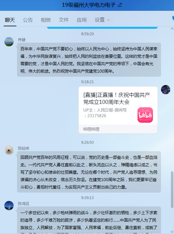 2019级控制工程2班:我们生在红旗下,长在春风里。人民有信仰,国家有力量,民族有希望。目光所至皆为华夏,五星闪耀皆为信仰!愿以吾辈之青春,捍卫盛世之中华!回望过去,展望未来。百年风华,再起征程!祝福党、国家、人民的未来越来越好!