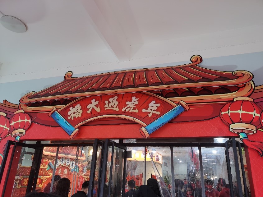 康礼炜:进入餐厅先发了一条红色的围巾,餐厅也挂上了灯笼、海报等等喜庆的装饰,中间的展台展示年夜饭将会呈上的几大菜式,两边还有自助的水果、小菜。带着红围巾的人群、明亮温馨的灯光、喜庆的装饰让人忘了在异乡的孤独。在年夜饭开始前的短暂时间里,大家纷纷拿起手机记录在校过年不一样的温情时光。