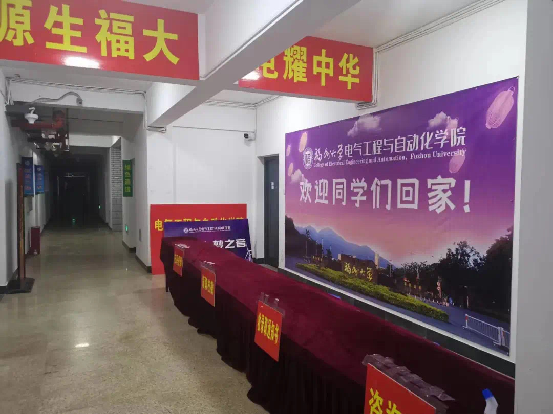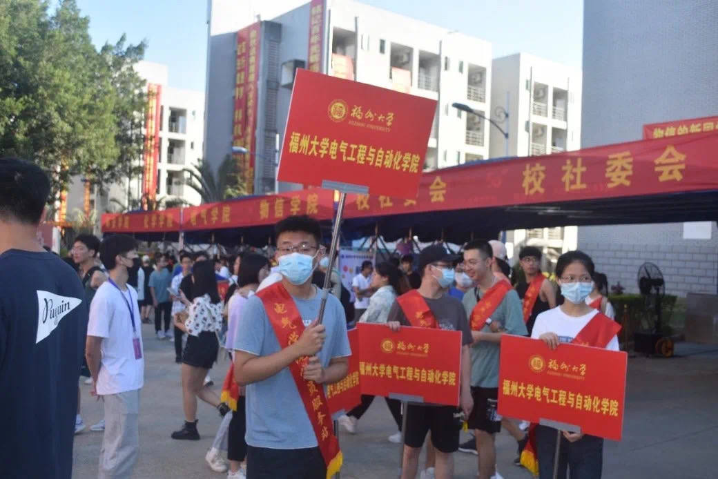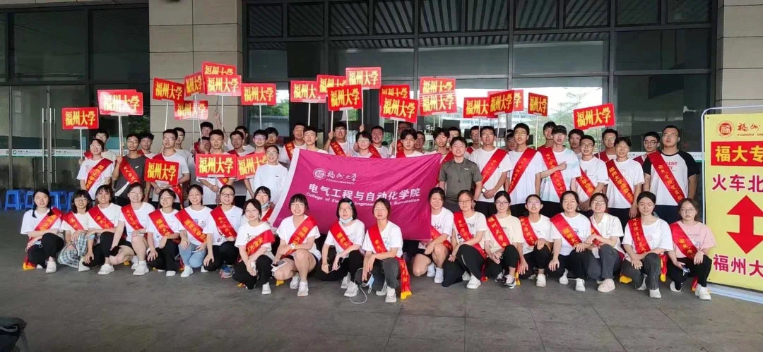 标志牌,舟车劳顿的疲惫感在这一刻消失殆尽,取而代之的是找到归属的激动与憧憬。这两天的福州虽然依旧烈日炎炎,但全体电气师生的热情更胜一筹,电气人的凝聚力在这时得到了充分体现,新生的大学篇章在最伊始就到达了高潮!