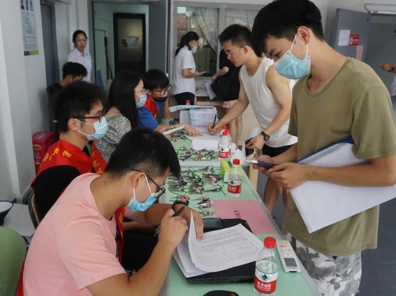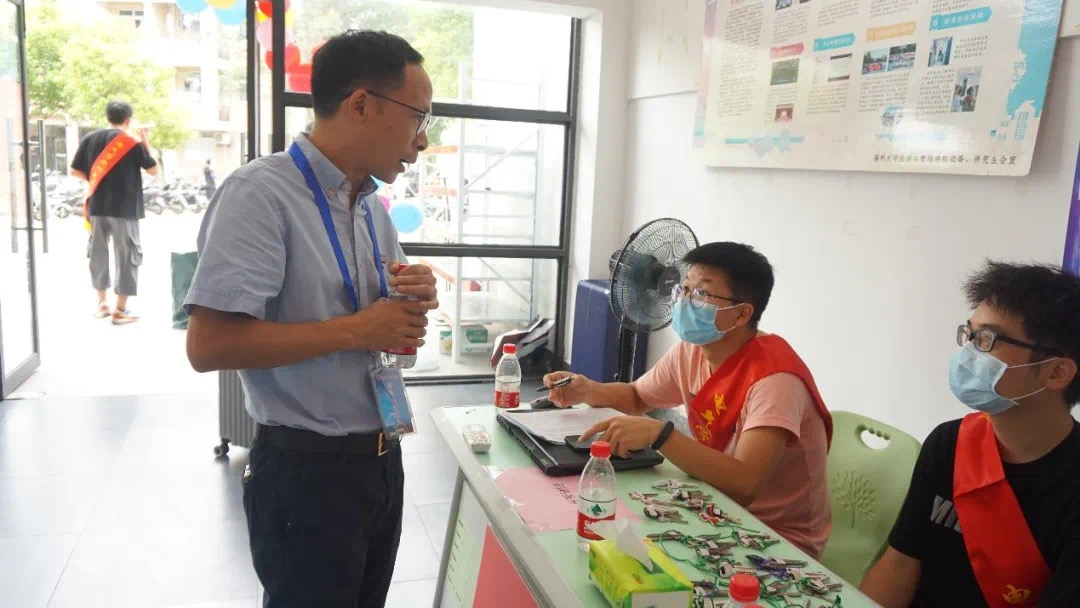 与此同时,学院团委学生会、研究生会工作人员已经在各自迎新报到处排好长桌,立好引导牌,以饱满的精神准备迎接新生的到来。志愿者们佩戴绶带,在校门口、报到处、生活区等地主动帮助新生,以积极的服务态度和高效有序的工作帮助新生完成报到工作,入住新宿舍。