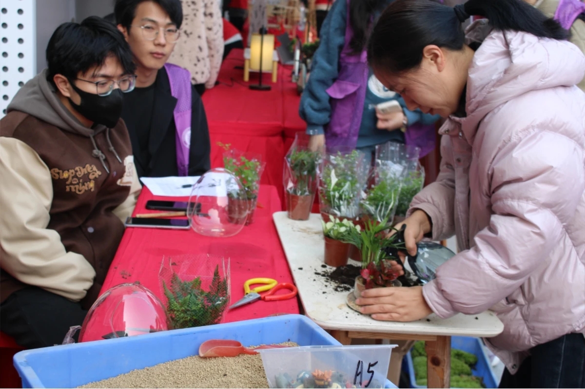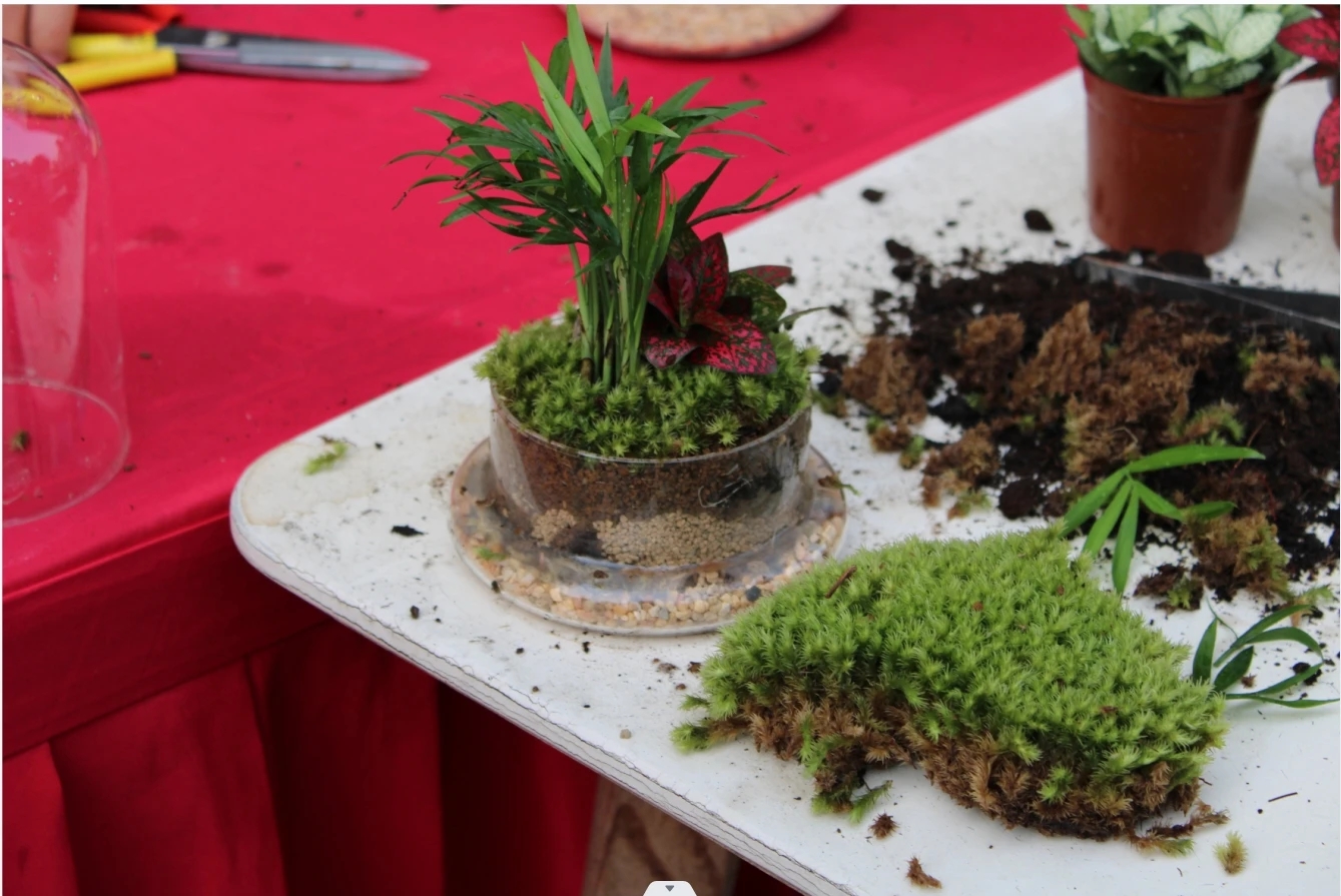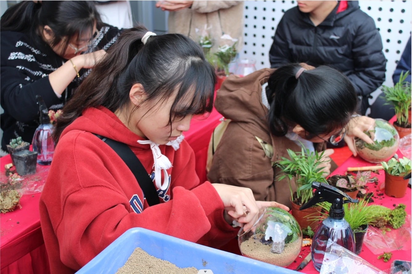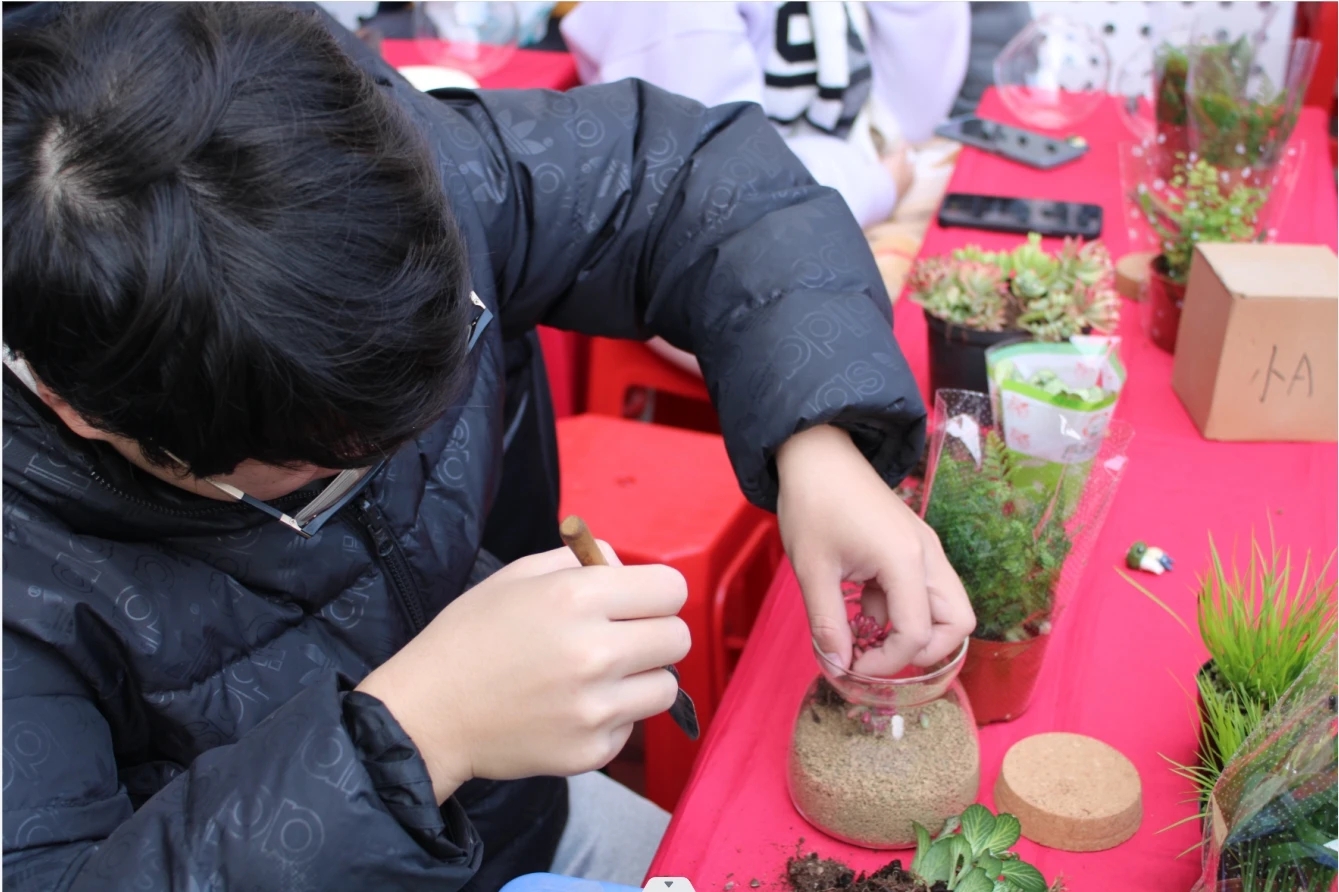 经过花艺师的指导和示范,现场人潮涌动、师生们纷纷跃跃欲试,活动预约人次高达85人次。在经验丰富的花艺师的指导下,同学们发挥想象力与创造力,在老师的指导下精心挑选了心仪的植物并做好摆放,精心搭配了石头、小饰品等元素,通过独特的设计、装饰和布置,将一个渺小的植物世界变幻为独一无二的艺术之作,从而设计出属于自己的景观盆栽。这些微缩的花园,仿佛是一幅细腻的画作,在参与者们的巧手下展现出了独特而优雅的风貌。