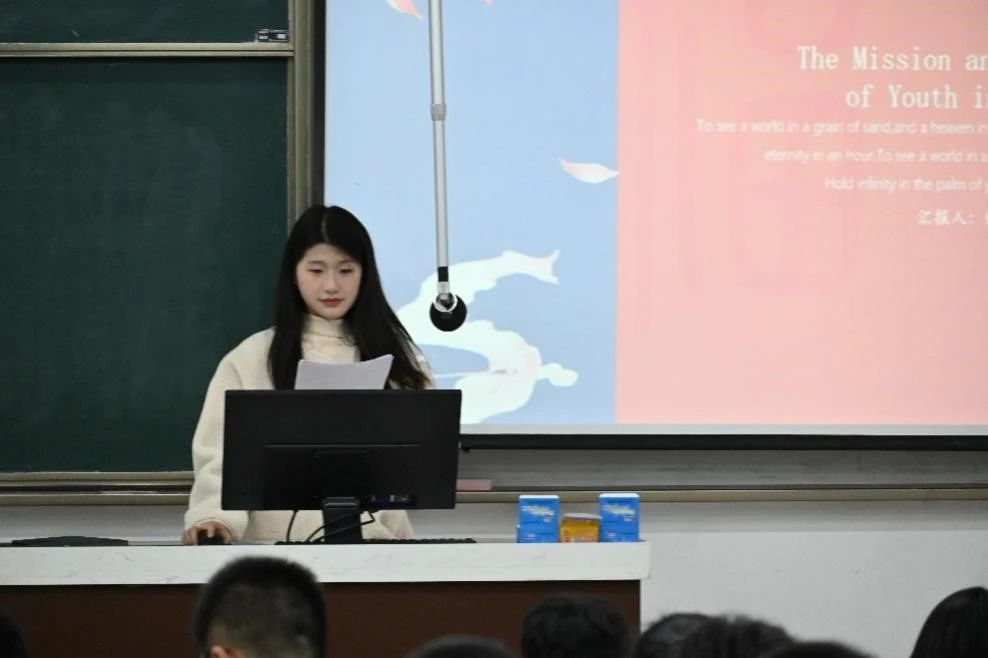 六号选手王心琳以夏森女士为范例介绍了新时代之楷模,为我们青年指引了方向,呼吁团员青年们向夏森女士学习,将甘于奉献的美好品质与砥砺深耕的不朽精神一代代传承下去。