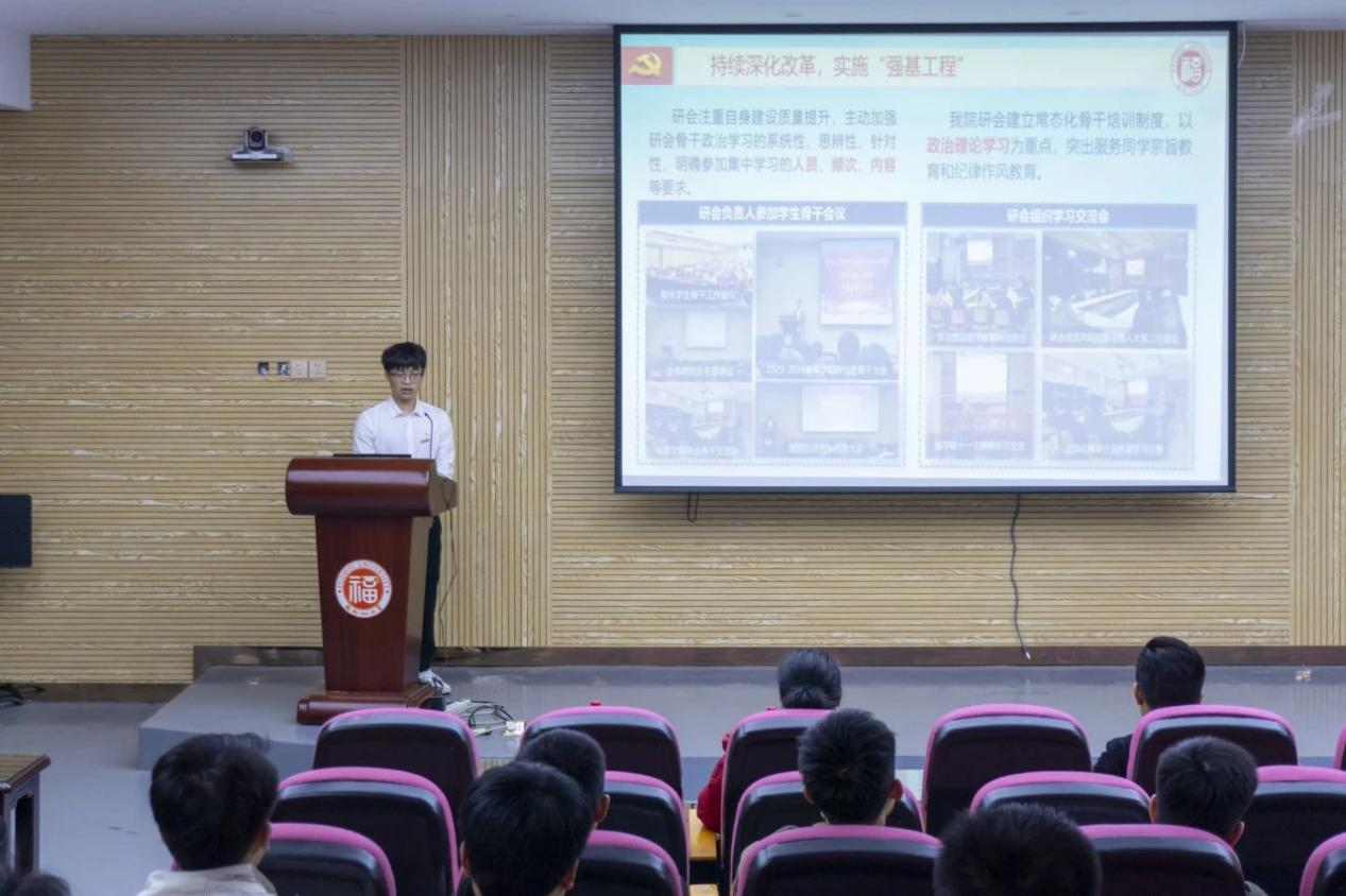 研究生会执行主席林凯瑶围绕践行服务宗旨,务实“三大工程”,深化改革成效以及实现“三个目标”的主题,详细汇报了研究生会在组织建设、思想建设、成员自身建设以及学院品牌建设等方面所取得的工作成效,同时,他也对未来工作进行了规划,旨在构建更加协同合作的工作格局,凝聚青春向党的工作氛围,塑造清新阳光的工作形象。