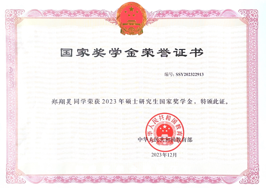 本硕期间,郑翔昊勤学苦练,精益求精,以高标准严格要求自己。本科期间,郑翔昊的成绩排名为18/282,在专业前7%,曾获两次校二等奖学金和一次校三等奖学金,并获校优秀毕业设计荣誉、被评为院优秀毕业生、校优秀学生干部。硕士期间,郑翔昊保持着优异的成绩,排名为9/131,在专业前7%,获得了研究生国家奖学金、优秀学业一等奖学金、研究生助研奖、福建省电机工程学会优秀论文一等奖。