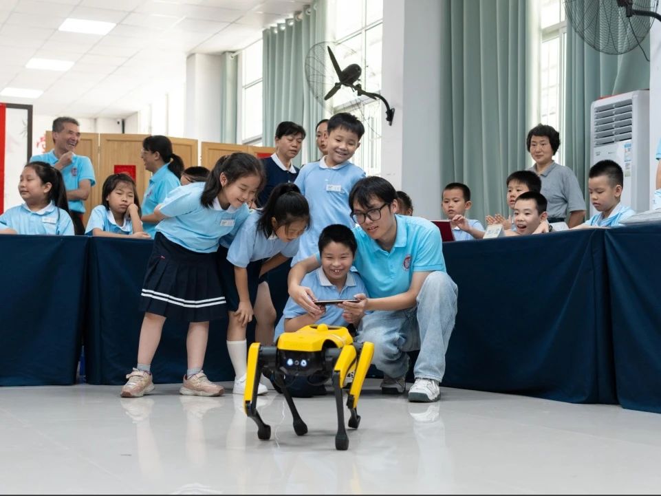 课堂上,实践队员们通过图片、视频和实物,为学生们讲解了机器人的基本知识,介绍了智能车、机器狗在农业、工业、物流业等众多领域的应用。学生们踊跃举手回答随堂问题,并在实践队员的引领下踏入科技探索的新世界。互动环节中,学生们亲自操控智能车与机器狗,并争先恐后地与实践队员畅谈未来机器人。
