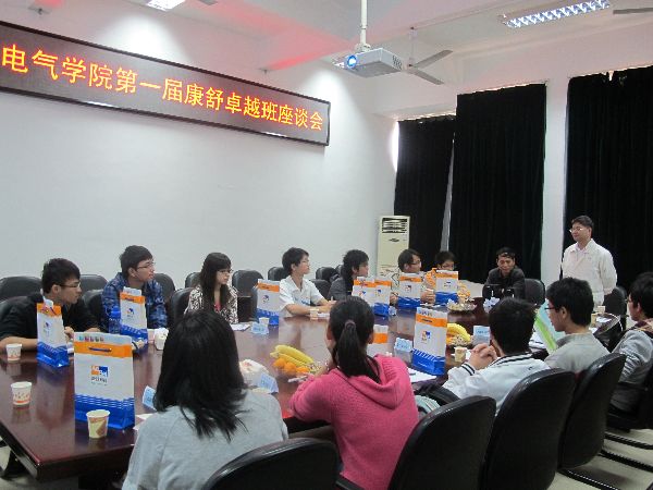 2012年11月14日10点半,电气学院第一届康舒卓越班座谈会在新楚楼会议室成功举办。出席此次比赛现场的嘉宾有电气学院副院长薛毓强老师,郑清井副理。