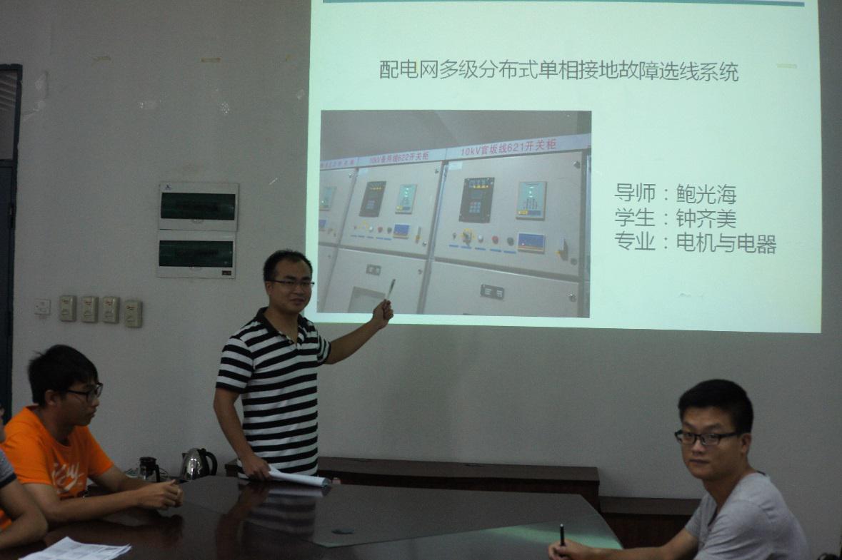 首先上场的是沈渊彬同学,他报告的题目是《模糊组合权重重构EMD和KF-BA-SVM短期负荷预测》,重点阐述了利用主成分分析方法(PCA)确定输入量,从而得到待预测日的负荷值。接着是钟齐美同学的《配电网多级分布式单相接地故障选线系统》,他介绍了三种中性点非直接接地方式以及馈线终端、母线集中器、选线主机的设计。紧接着,陈东鹏同学的《电力变压器油纸绝缘系统气隙特征分析》报告在理解介质响应理论基础上,建立模拟试验模型,研究了不同充电时间下绝缘系统中气隙含量的变化对回复电压特征参数的影响规律,表明回复电压特征参数可以有效衡量绝缘系统的气隙情况的结论。其次是翁桂萍同学的《计及峰谷电价和改进运行策略的风光储联合发电系统容量优化》,其在建立系统的优化配置模型的基础上,提出改进的运行策略,并以华东沿海某小区为例,验证所提方法的合理性和优越性。再者是吴小雁同学的《超高压交流输电线路电磁场计算分析》,在建立输电线物理模型的基础上,对其进行优化使得输电线下方的电磁场值更接近实际值。最后是鲍智恩同学的《低压配电网在线监测系统设计》,通过对现有在线监测系统比较和分析,综合考虑系统信息传递的高效性,信息的安全性,低压配电网管理的便捷性,采用C/S和B/S混合式结构的低压配电网在线监测系统设计方案。