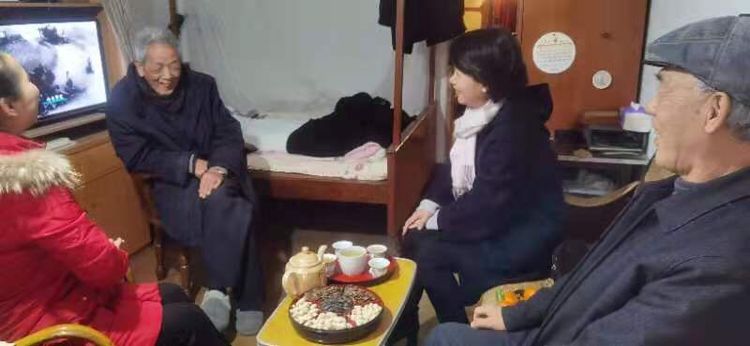 现场会后学院领导、工会委员、退休支委及退协委员分五组前往病困、独居老同志的家中或养老院进行元旦、春节慰问,这是慰问郭廷惠老师。