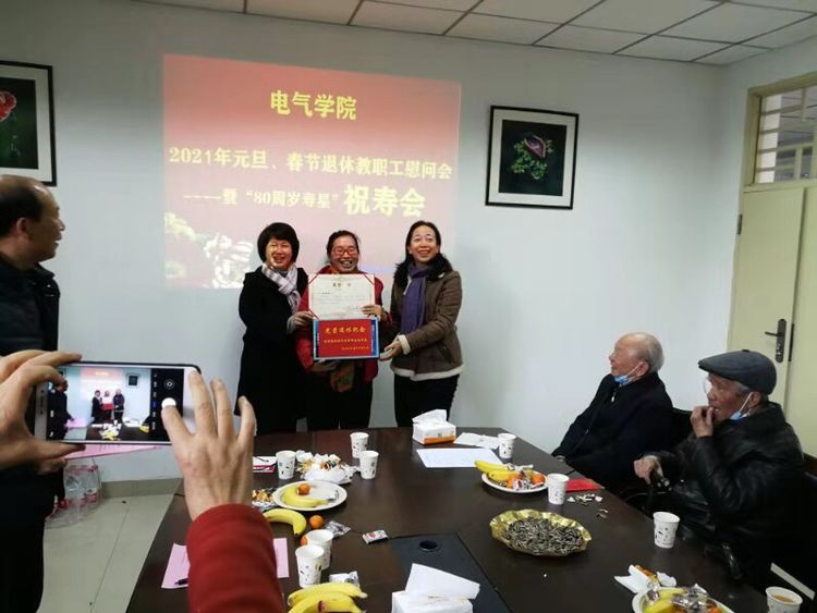 林雪健代表电气退协,向学院领导及到达现场的“80岁寿星”们汇报了电气退协在2020年所做的工作。其中,谈到了在2020年上半年退协委员们为了顺利完成疫情防控进行的“日报告”、“零报告”中所付出的辛苦。也谈到了在去年疫情严峻期的一些感人事例,比如:在大家出门处于束手无策的时候,办公室主任谢荣华给退协发来信息“老同志有什么困难需要帮助,我愿意当一位自愿者给予帮助”。