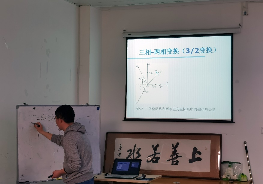 最后是杨公德老师讲解基于动态模型的异步电动机调速系统课题,杨老师用详细的幻灯片和条理清晰的板书向我们展示了坐标转换的基本思路和三相与两相的变换,杨老师语言标准、思路严谨,给我们留下了深刻的印象。