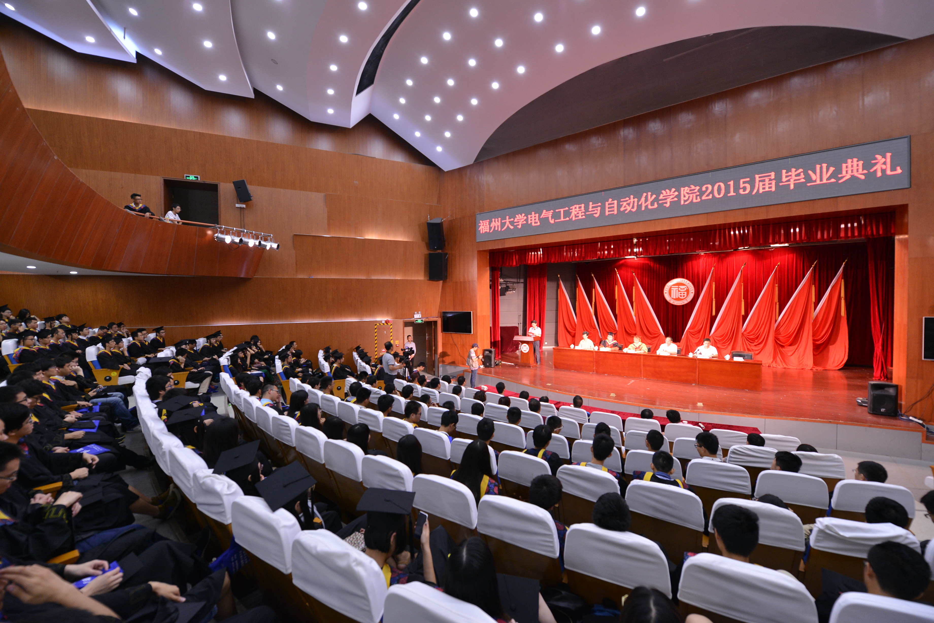 2015届毕业典礼在图书馆博学厅隆重举行。电气学院党委书记何希耕、院长陈为、党委副书记黄国辉、副院长缪希仁、副院长薛毓强、院工会主席杨明发、各系主任、党支部书记、副主任、部分教师代表、部分学生家长代表及2015届全体毕业生出席了毕业典礼。本次毕业典礼由黄国辉副书记主持。