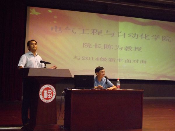 博学厅准时召开。电气学院院长陈为、副院长薛毓强、2014级辅导员尹万东老师莅临本次大会。本次大会由尹万东老师主持,与会2014级本科新生及各班级助导等共四百余人。