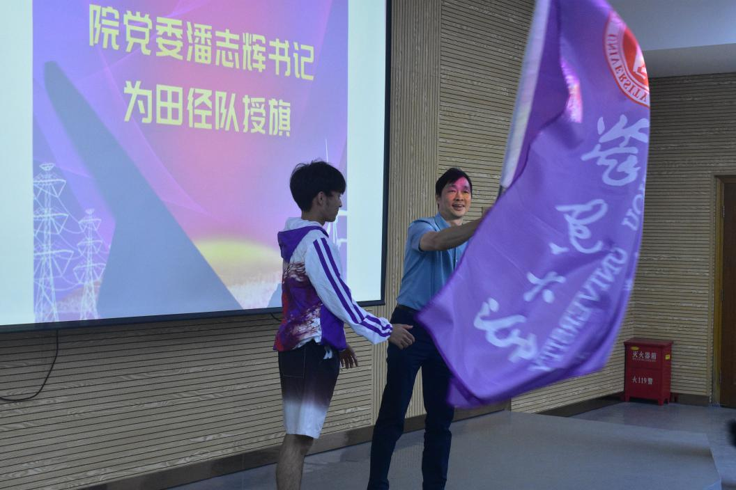 会议临近尾声,由院党委潘志辉书记为田径队授旗。紫色旗帜从潘书记的手上交至田径队林炜同学的手上,他代表田径队队员们接下了为院争光的任务,他们必将在接下来的集训中全力以赴,力求在校运会中勇夺佳绩。