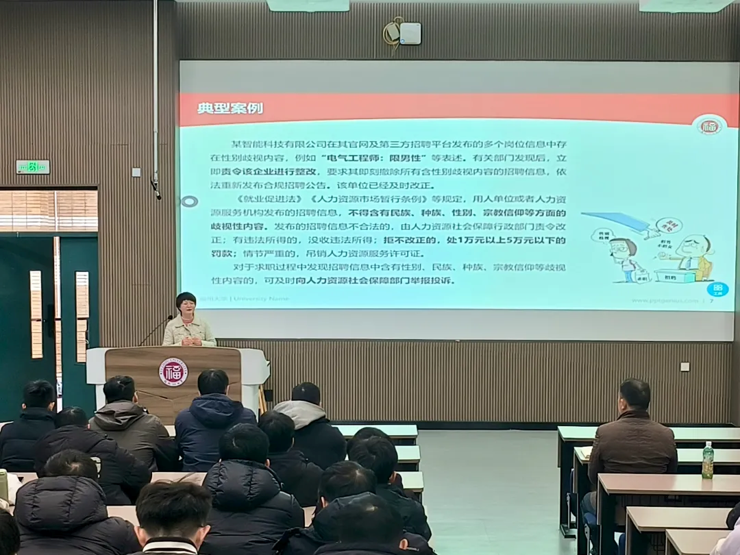 杨莉萍副教授分别从“开篇——职场有风险,普法须先行”、“迈好第一步:入职环节的法律风险防范”、“稳定与发展:在职期间的权益保障”、“好聚好散:离职环节的权益清算”、“聚焦当下:新型用工模式与争议热点”、“维权指南:权利被侵犯后的救济途径”六大方面为学院毕业生详细讲述了职场中的一些陷阱以及遇到争议时如何解决,提出了“灵魂三问”:1、你签劳动合同了吗?指出入职不是简单的“签合同、办手续”,而是明确双方权利义务的关键起点,要警惕隐藏的“职场陷阱”;2、公司能随意调整你的岗位和薪资吗?指出在职期间是劳动者履行义务、获取回报的主要阶段,需重点关注劳动报酬获取、休息权利、安全保障等;3、离职时,你的经济补偿金算对了吗?指出无论是“主动辞职”还是“被动解除”,都需依照法定程序,避免因流程不当损失应得权益。