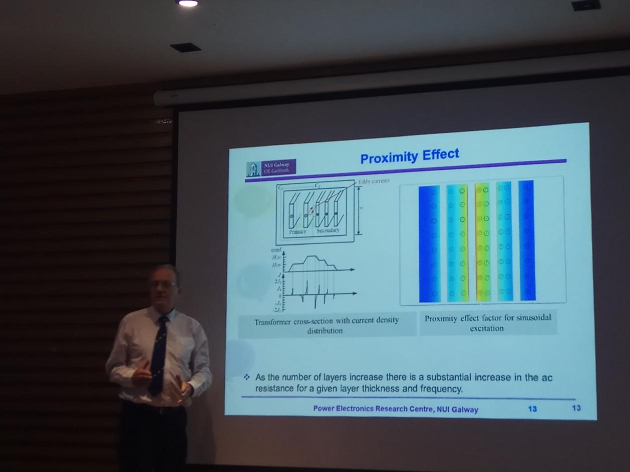 William Gerard Hurley,爱尔兰国立大学电气工程专业教授,同时担任该校电力电子研究中心主任。Hurley教授主要的研究方向是高频磁性元器件、电能质量、新能源系统等。本次学术报告的题目为Challenges and Trends in Magnetics for Power Electronics(电力电子学在磁领域的挑战与趋势)。报告内容集中在电力电子学在研究和设计方面的挑战、趋势以及应用现状。Hurley教授介绍说当下电力电子技术朝着高密度,高效率电源的方向持续增长,其中降低电源尺寸的关键是高频运作,而瓶颈则是磁性部件的设计。宽带隙器件如SiC和GaN的最新发展开辟了更高工作频率的可能性。Hurley教授认为当前的磁性部件的挑战包括了:封装、漏电感、高频损耗低的磁性材料、集肤效应和邻近效应在内的高频效应以及带隙电感器和变压器的边缘效应。而另一方面,通过具有可重复参数(如电感和电容)的自动化制造工艺,使得平面磁件的可靠性提高了,为无线电力传输(WPT)从电动汽车无线充电到物联网(IOT)的各种应用提供了无限多的机会。