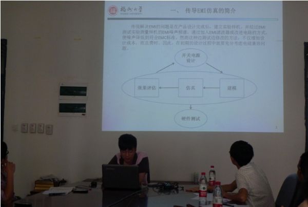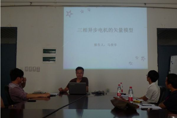 首先亮相出场的是黄伏送同学,介绍其对三相Boost型并网逆变器的理解及研究;接下来的是周伊玲同学对“准单级推挽正激式光伏并网逆变系统”的讲解,谦逊的态度和临场应答为报告加分不少;紧接的张煜同学,略带腼腆的他跟大家分享的是“传导EMI建模与仿真分析”;钟晓龙同学做的是时下最炙手可热的课题——无线电能传输技术,并PPT中展示了实物,点亮了2个LED,并指出了其传输效率的问题;其后的郑剑斌同学讲述的是“磁通门电流传感器磁系统研究”;最后是马俊亭同学做关于三相异步电机的矢量模型的分析,独到的见解和细心地科研态度在其满满的公式推导中可见一斑。