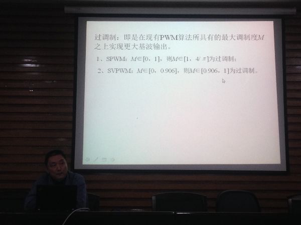第一个作报告的是电气学院院长——陈为教授,他所作的报告题目是《无限电能传输(WPS)技术》,在比较了无线电能的传输方式的基础上,根据WPT对磁耦合系统的要求,提出了一种提高耦合系数的方法,并介绍了目前他的两个研究项目——电动汽车无线充电磁系统以及家用无线搅拌器;接下来是金涛教授,年轻帅气的他与大家一起分享了《电气设备的监控、智能输变电设备的工艺优化》;王榕生教授则对《基于优化的准正弦平顶调制波PWM过调制新技术》进行了讲解,他着重介绍了PWM过调制的算法以及谐波数值的分析,最后通过实验验证了理论分析的正确性;林维明教授做了关于《LED灯调光技术及其发展》的报告,通过介绍PWM调光以及线性调光的特点,得出组合调光策略更能发挥LED优良光学特性的结论;接着由林国庆教授详细的阐述了《HID灯声共振现象及抑制技术》;最后一个出场的是陈道炼教授,他就《全桥Boost多输入直流变换器型新能源分布式供电系统》与大家进行了交流。